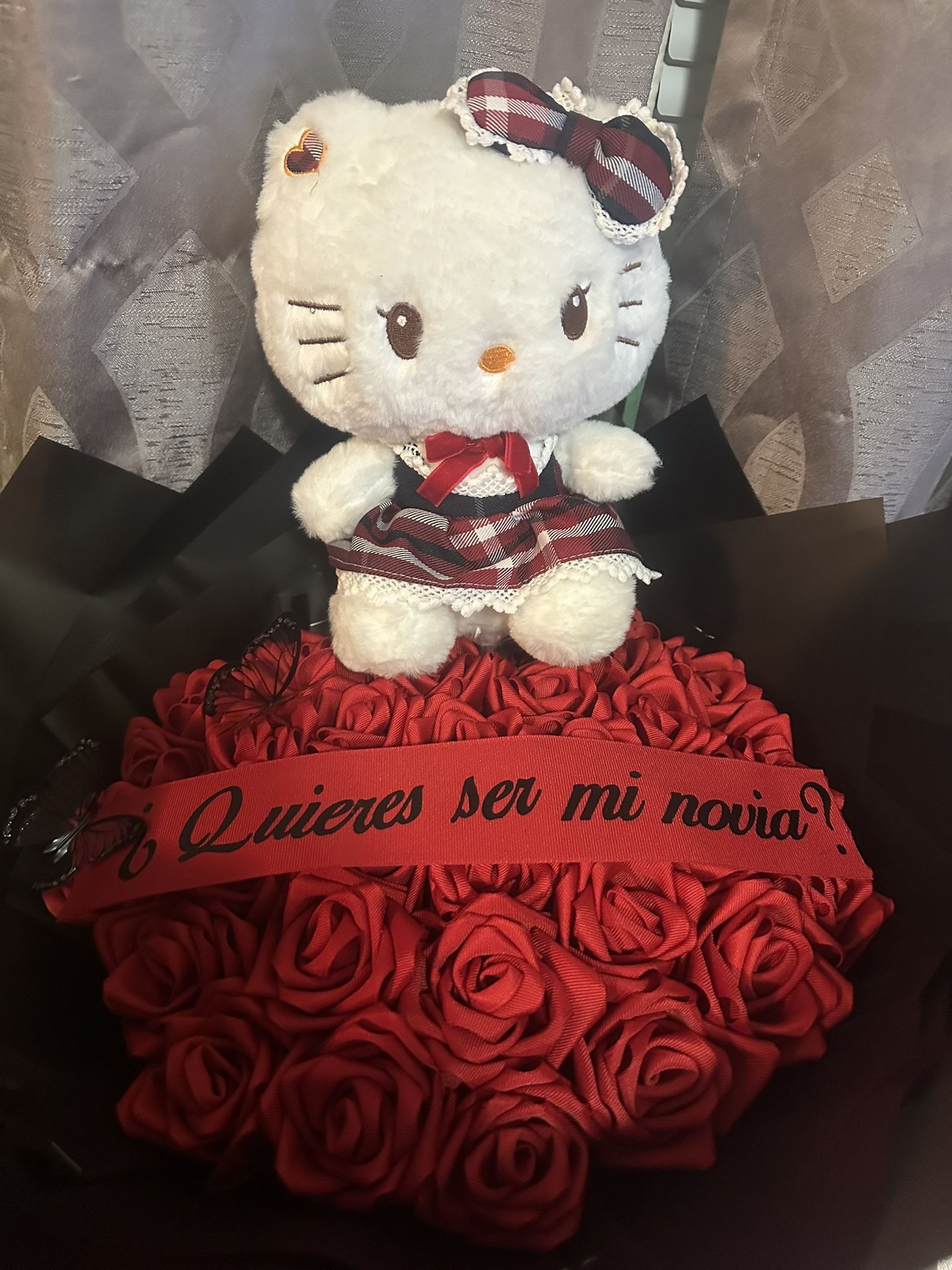 Eternal red rose hello kitty bouquet with black butterflies. Perfect for valentines day