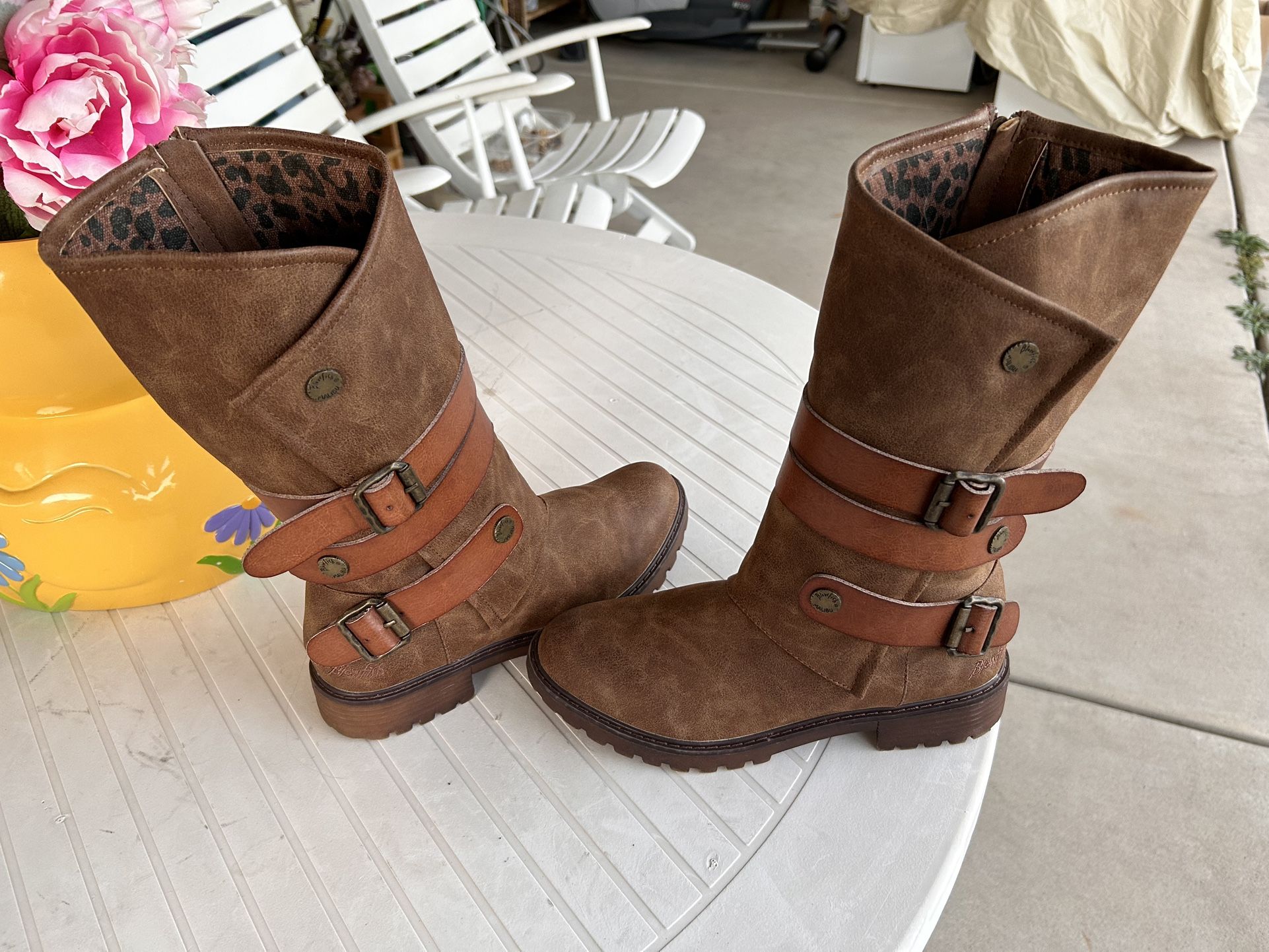 The raexly boot from Blowfish Malibu rocks vibes with its wrapped buckle strap and rugged lug sole. The mid - calf boot rocks with any cool weather look. Brown mid-calf, vegan - friendly boots with buckle detailing. Faux suede upper inside zip closure. 12” hight, 1.5” stacked block heel. Size: 8.