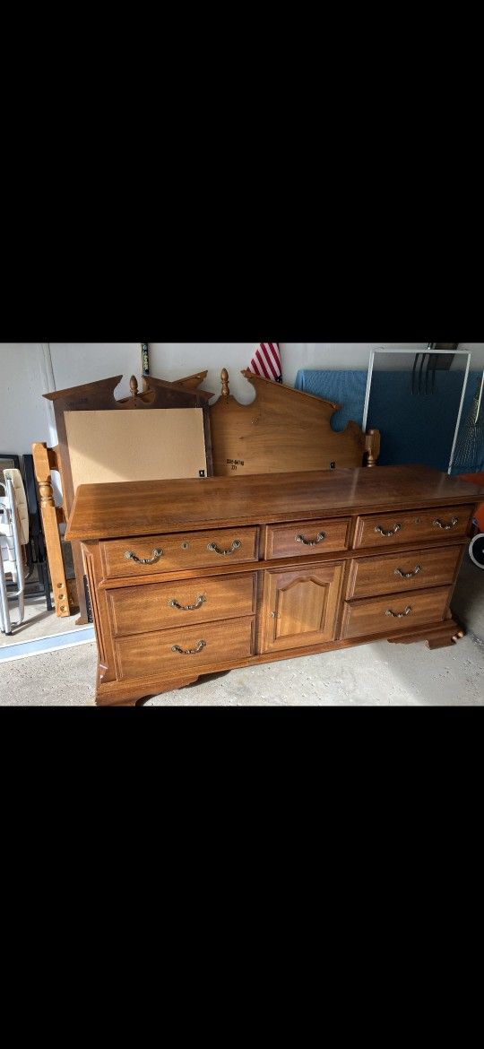 2 piece bedroom furniture set in excellent condition. Dresser measures 66” L x 19” W x 31 1/2” H. Headboard is for king size bed. Decorative posts are removable.