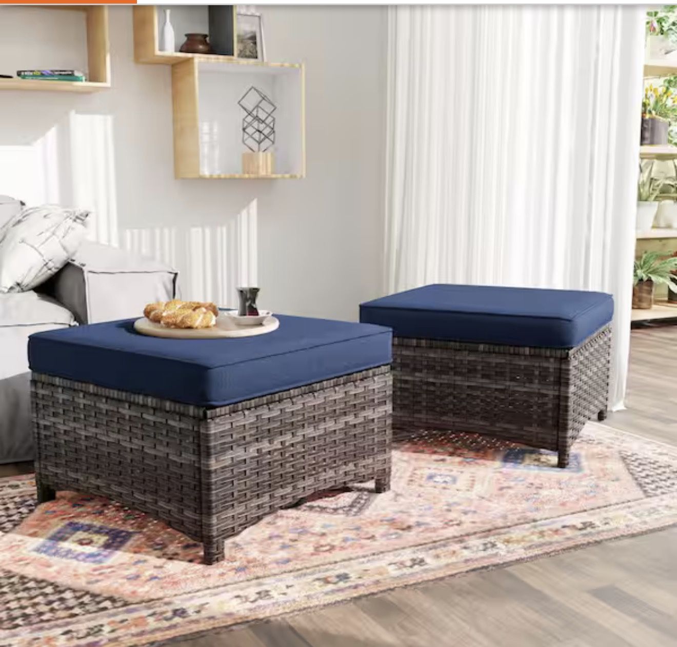 Brand new in its own open box Retail price is :$ 198 plus tax Can be delivered within 10 miles for extra charges JOYSIDE Wicker Outdoor Patio Ottoman with Blue Cushions (Set of 2) LEISURE OTTOMANS: 2 ottomans are ideal for both indoor and outdoor use, working as seats, footrests or coffee tables HAND-WOVEN PE WICKER: JOYSIDE leisure ottomans are fully wrapped by hand-woven PE wicker that features excellent fade resistance and strong resilience to avoid deforming and cracking MORE OPTIONS: five colors are available - beige, blue, red, orange, green STURDY AND STABLE: the whole steel frame is powder-coated to ensure its long durability and resistance to rust, and the max weight capacity is 110 lbs COMFORTABLE SEATING: the cushions are made of premium olefin fabric and 100% polyester filling to provide utmost comfort