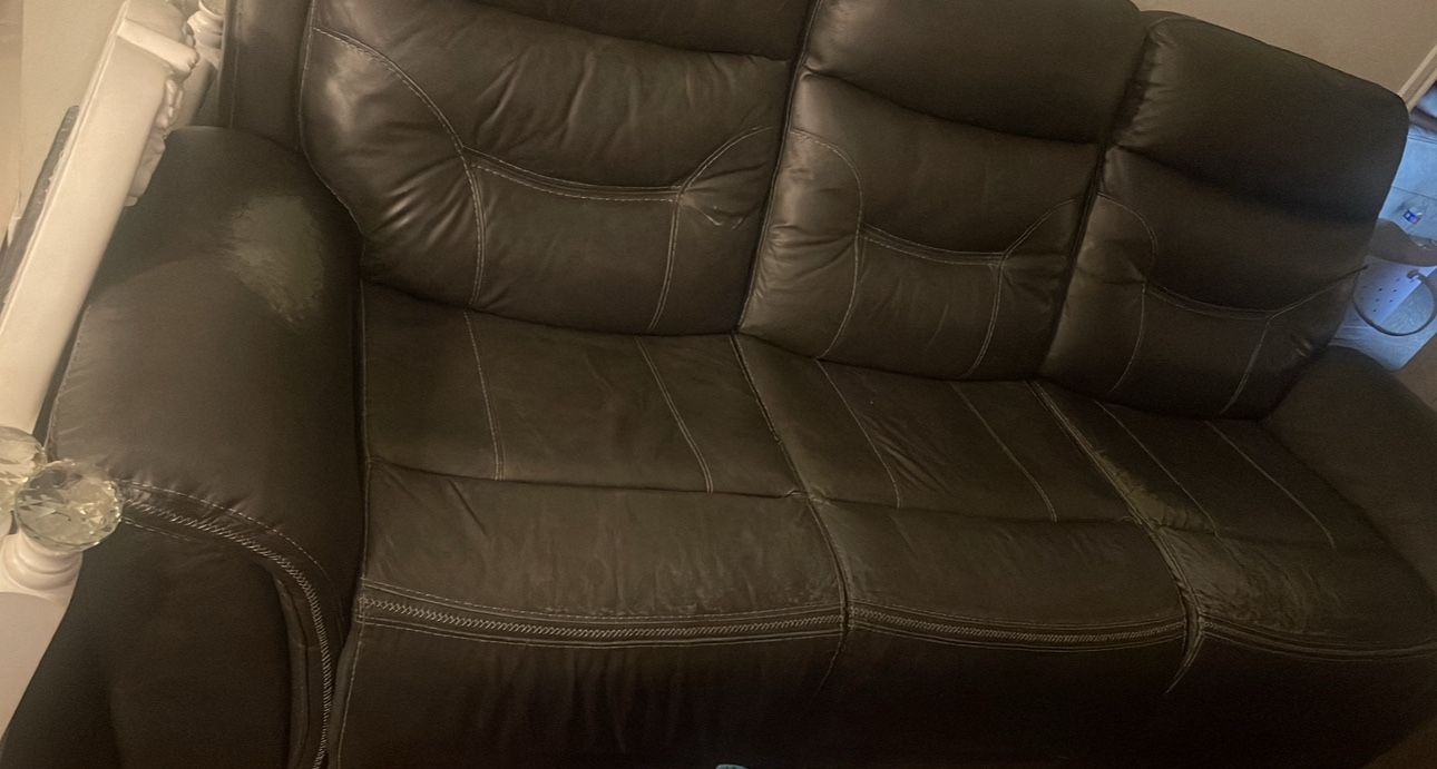 Nice sofa. Couple of worn spots but it can be touched up with leather spray. Not peeling. Great deal!!