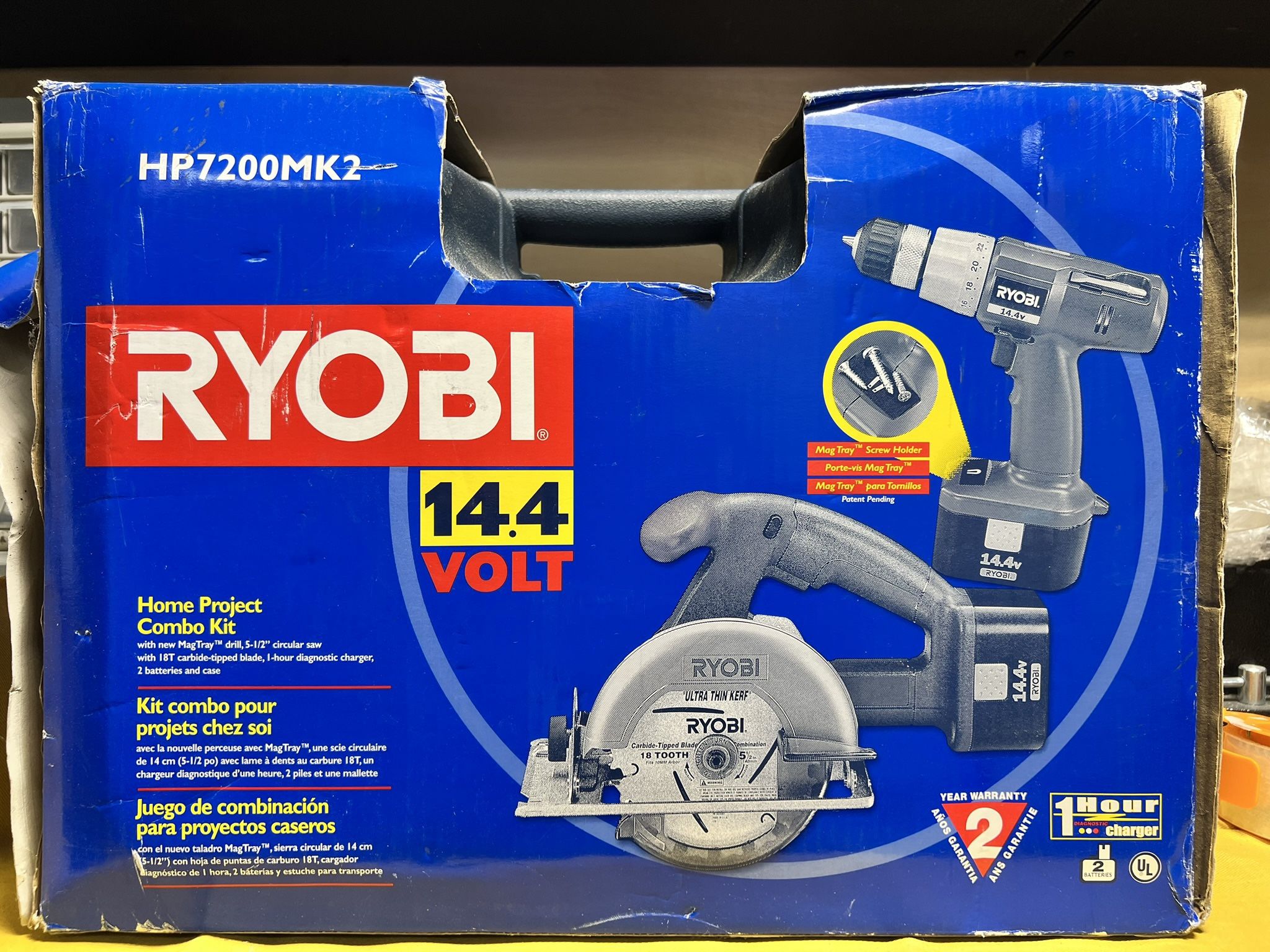 Brand new Ryobi HP7200MK2 14.4 V cordless power tool combo. Box opened only for testing. Never used. Includes drill/driver with 1/2” chuck and circular saw and case. Comes with 2 Ryobi 14.4 V batteries and 1 charger