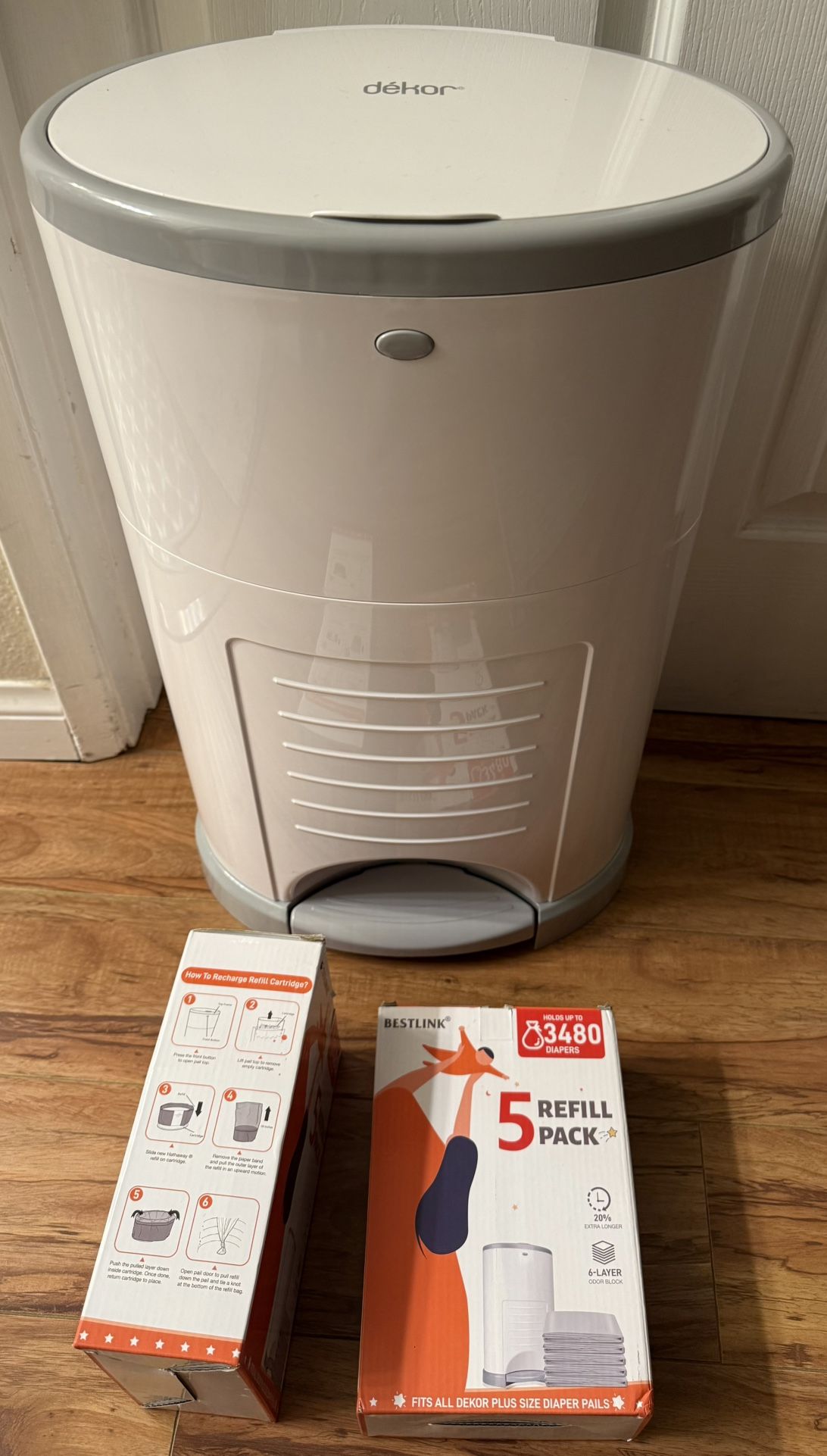 Baby diaper pale decor plus in white colour. Used but in good condition, clean One full package of refills and one more open and only one used .