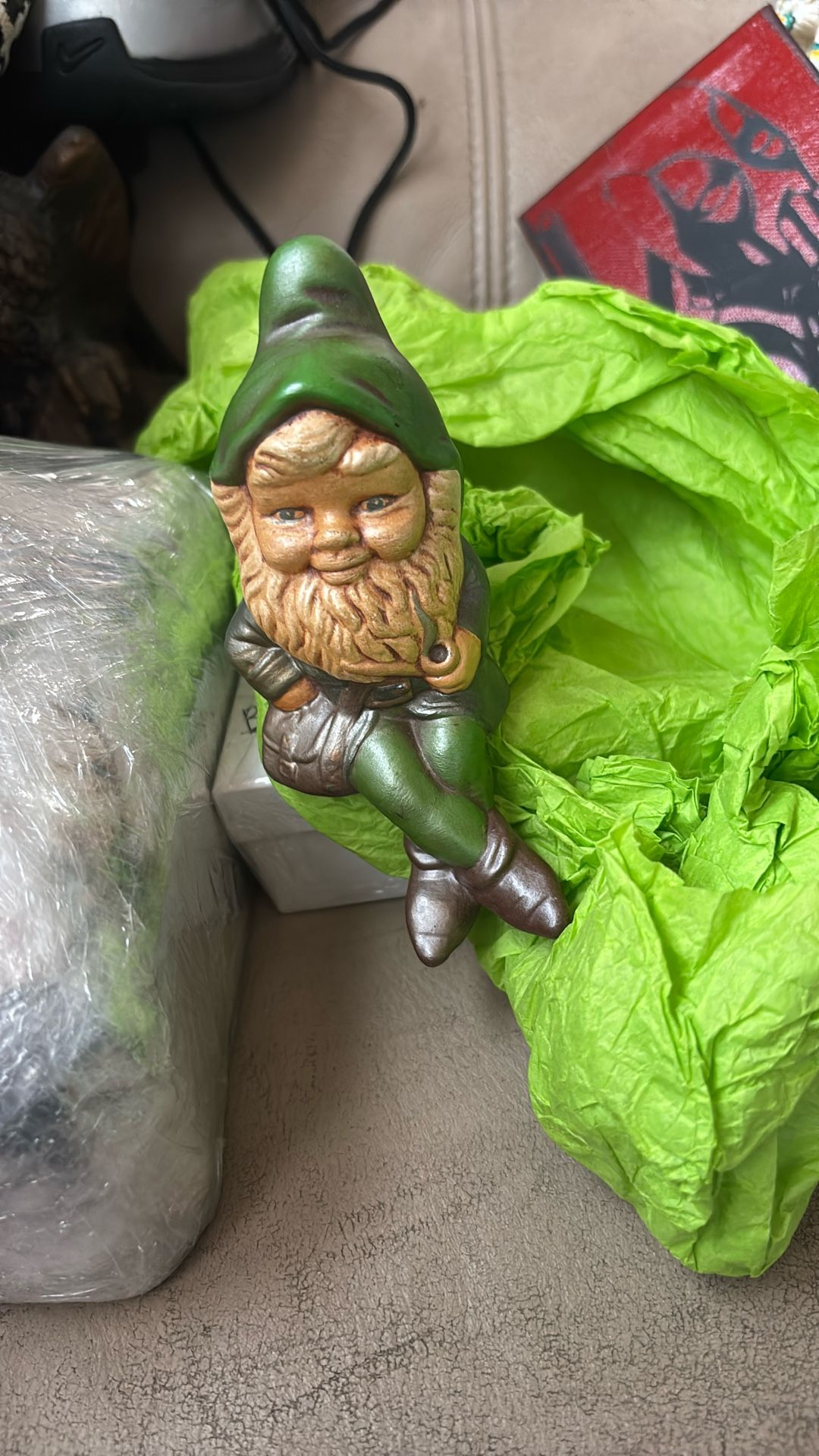 2 vintage ceramic garden gnome figurines These types of gnomes originated in 19th-century Germany and are rooted in European folklore, where they were believed to bring good luck and protection to homes and gardens. The figurines are made of ceramic. It is a decorative object often used in gardens or as home decor. It depicts a male dwarf wearing a green pointy hat and carrying a satchel, consistent with traditional gnome depictions. The red one is napping. Gnomes are also associated with fertility and abundance and are considered protectors of the natural world.