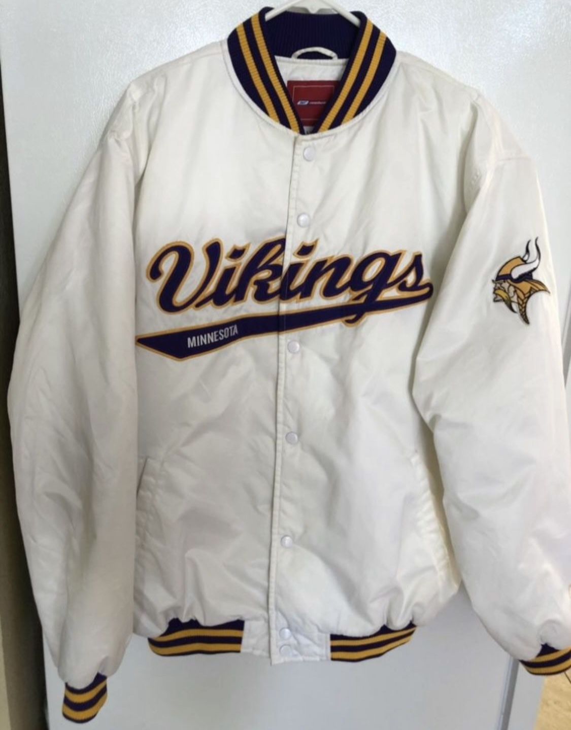 Preowned Minnesota Vikings Full-Snap Reebok White nylon outer Satin Lined Jacket Men’s Size Large Great condition. No rips or stains. Full snap front. Zippered inner pocket. Please see all the photos. Pickup in East Modesto Cash only No trades