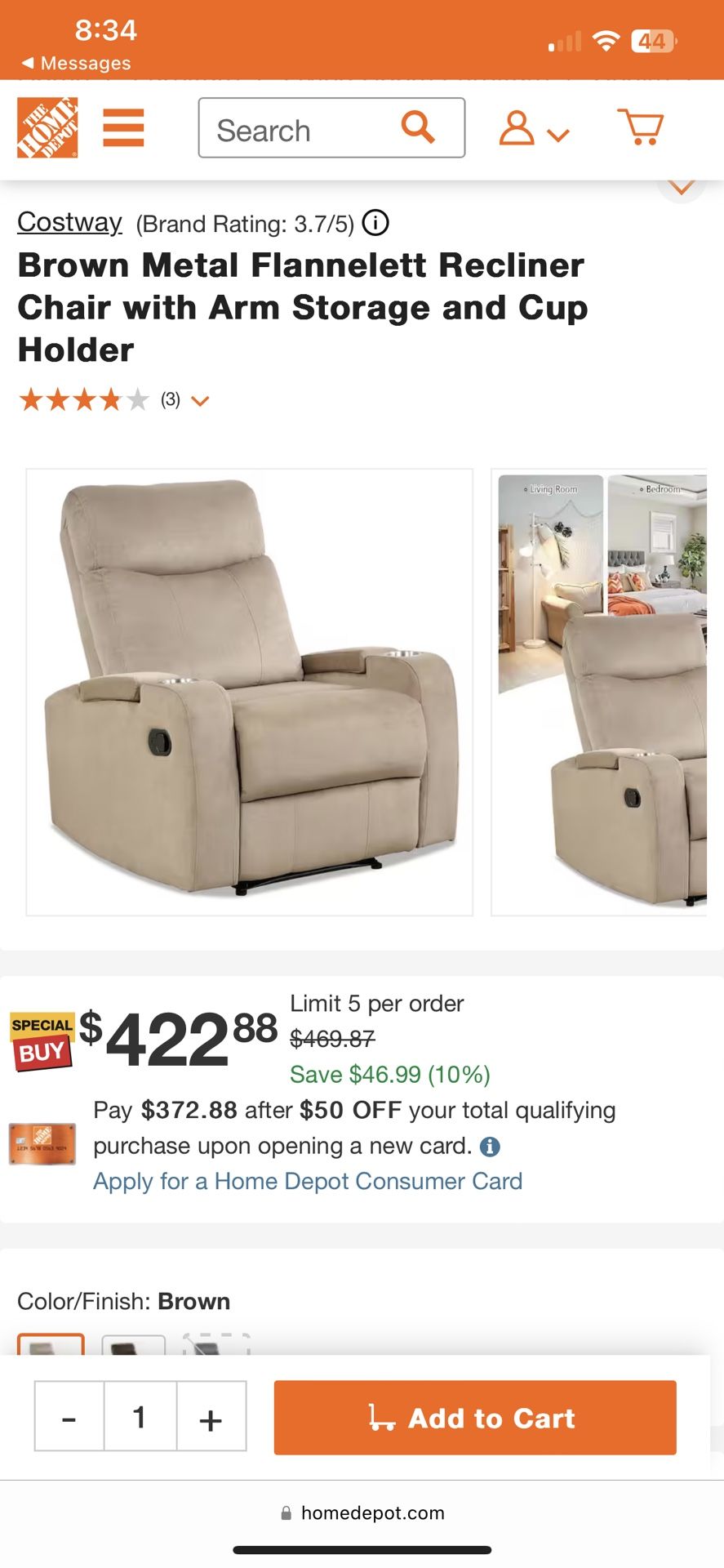 Brown Metal Flannelett Recliner Chair with Arm Storage and Cup Holder