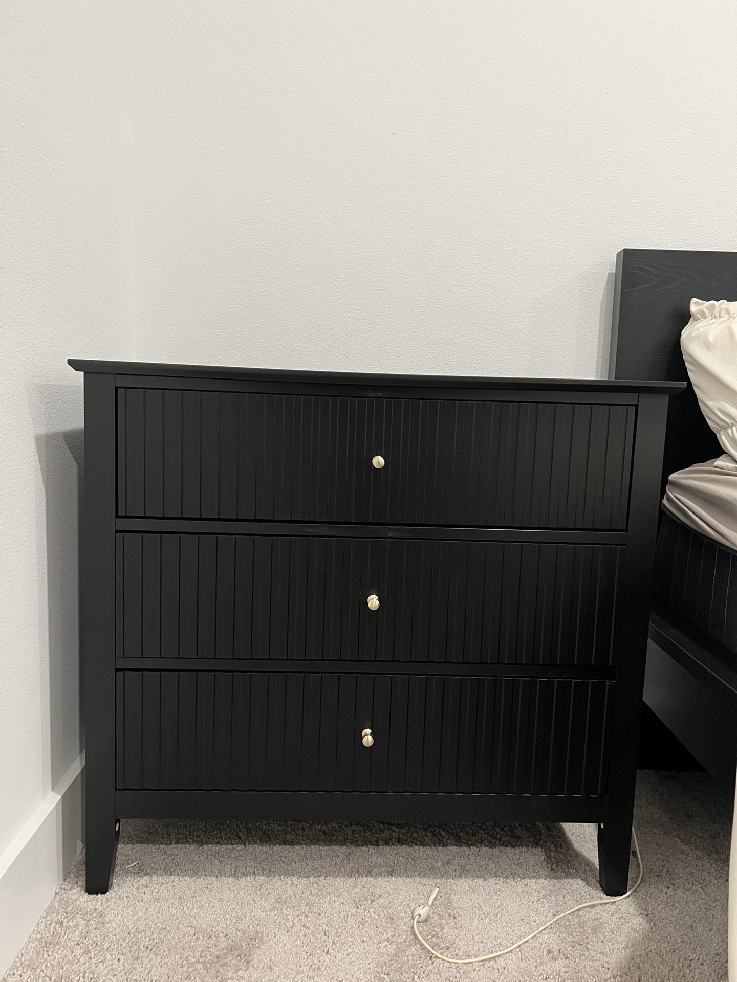 Stylish and functional black nightstand featuring a sleek modern design with vertical fluted drawer fronts and elegant gold knobs. This bedside table includes three spacious drawers, perfect for organizing books, electronics, clothing, or other bedroom essentials. The sturdy frame and clean lines make it a great addition to modern, contemporary, or minimalist bedrooms. The compact size fits well next to most beds while still providing plenty of storage space. The black finish pairs easily with many bedroom styles and color schemes. π¨ NEVER BEFORE USED π¨ ended up buying two and only needed