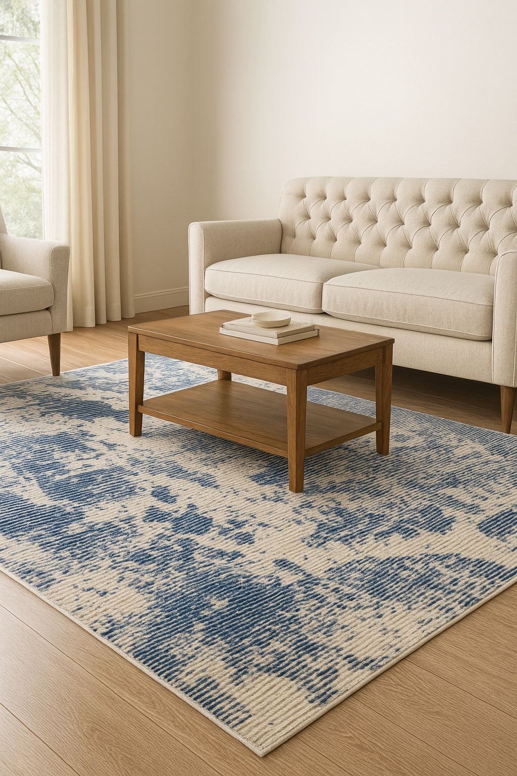 Modern 8x10 blue and cream abstract rug with textured design. Soft, durable, and stylish—perfect for living rooms or bedrooms. Adds a bold, contemporary touch to any space.