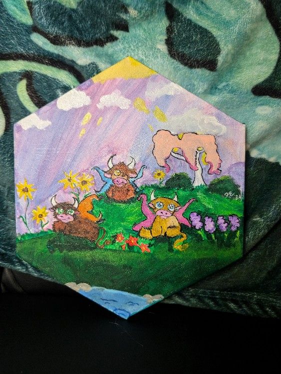 9x9" acrylic painting of highland cow fairies