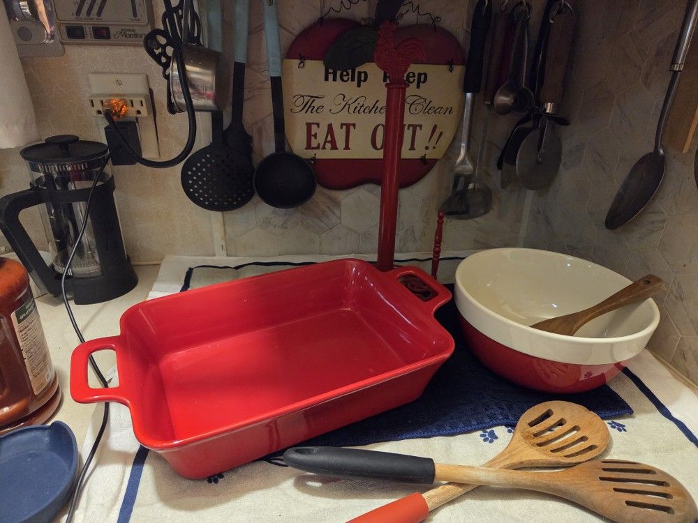 Items in new like condition, rooster paper towel holder mixing bowl, new banking pan, new cookie sheet 2 wooden spoons 2 gallon beverage container with flow spout, tea pot maker used 3 times, 2 cake plates