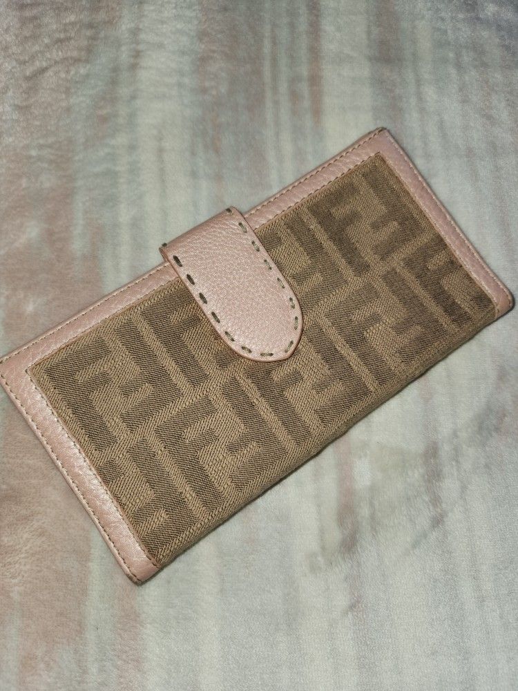 Very very good condition light wear CLEAN Real / Authentic FENDI Wallet 1 ID Slot 1 Exterior Pocket with closure 3 Interior Bill Pockets 8 Interior Card Slots Light Pink Leather and Fendi Canvas Pink leather has a shine to it NO LOW BALLS This is Real