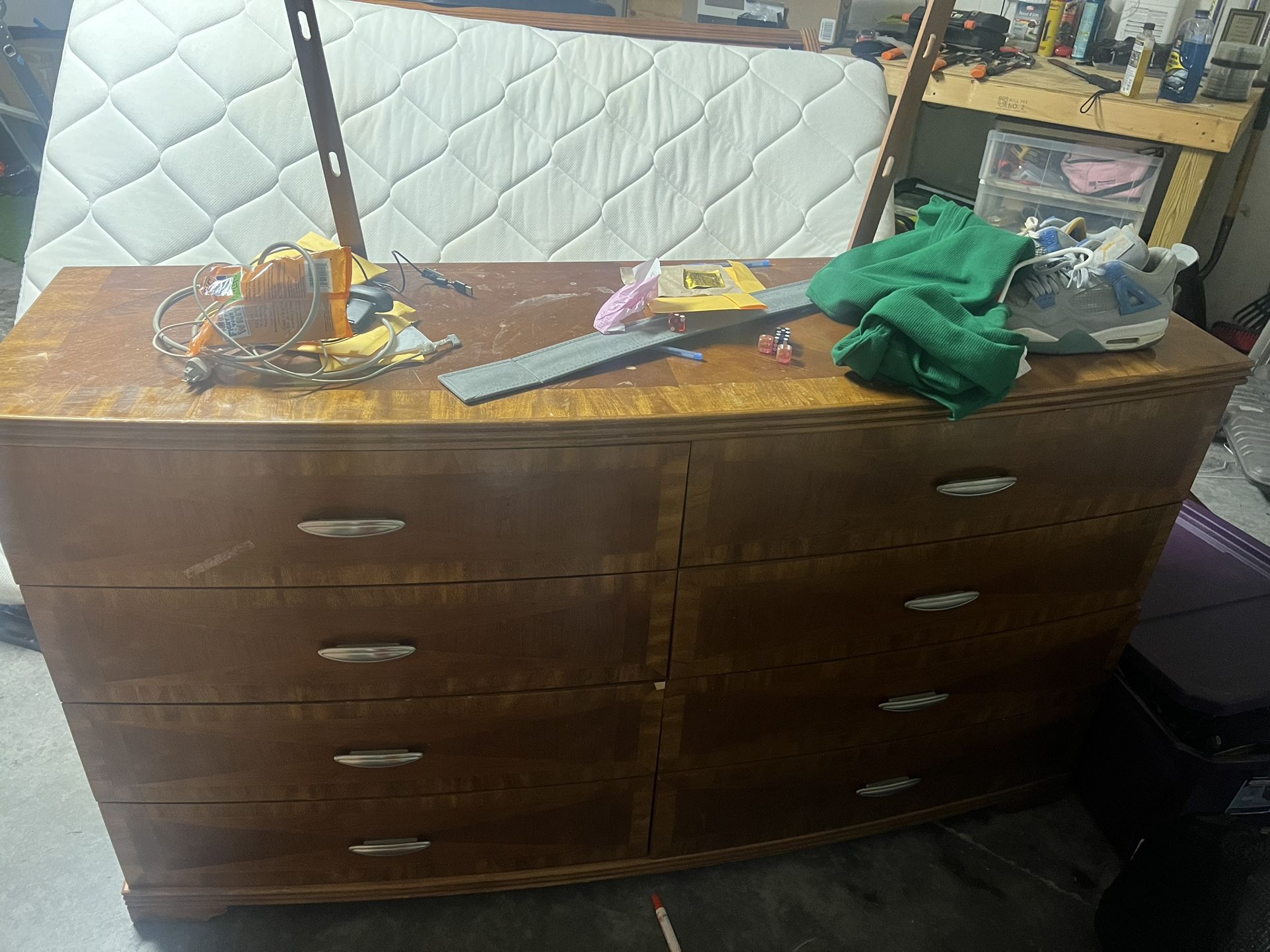 Pardon the mess in photos moving , extremely heavy dresser paid a high amount for it few years ago mirror attaches to it