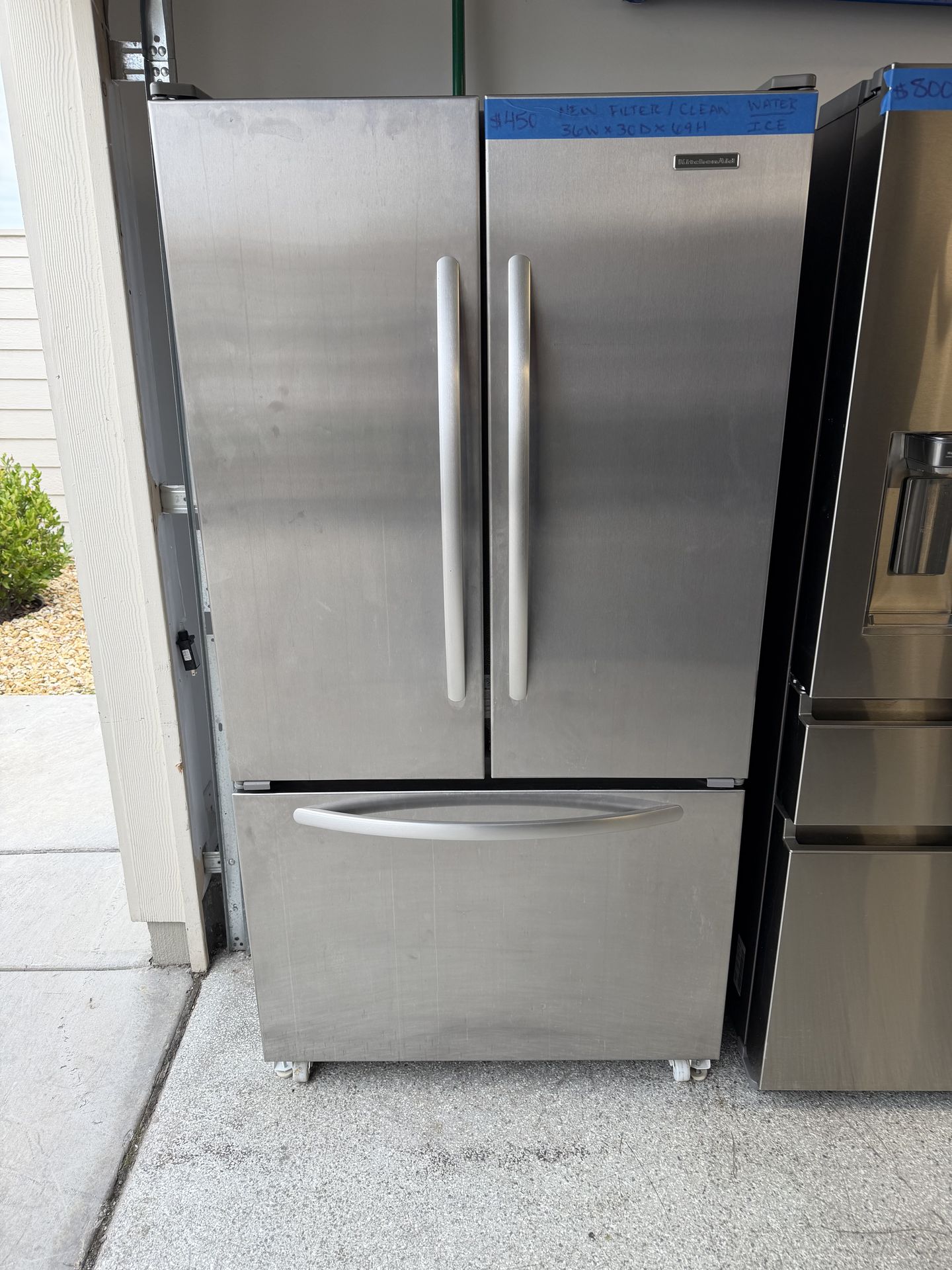 KitchenAid stainless counter depth refrigerator. Very good condition outside. Looks good. Inside is very clean. Has a new water filter has water in the fridge section and ice in the freezer size is 36 inches wide by 30 inches deep including the handles by 69 inches tall has a new water filter can deliver for a fee comes with a 30 day warranty with no refund