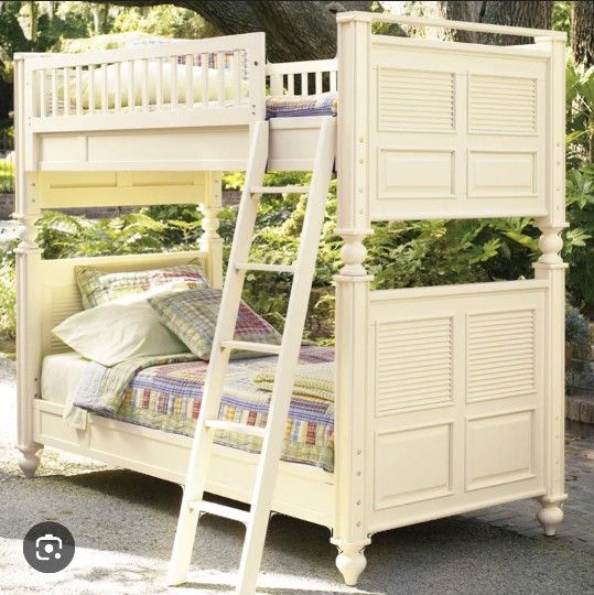 High quality solid wood myHaven bunk bed made by young America for Stanley Furniture Co. Light Blue color. Heavy and sturdy hardwood construction. Excellent condition w/ a few minor rubs and scratches esp where ladder attaches. Can assemble as a bunk bed or two twin beds. All parts, hardware, and assembly instructions included. Note: bunk bed is the blue teal color pictured as separate beds. The cream colored bed is a stock photo I found to show bed assembled as a bunk.