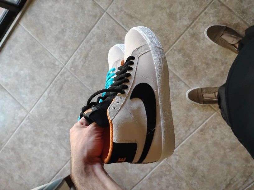 Brand new. They come with both sets of shoe laces black and teal no box they're just too narrow for my feet.