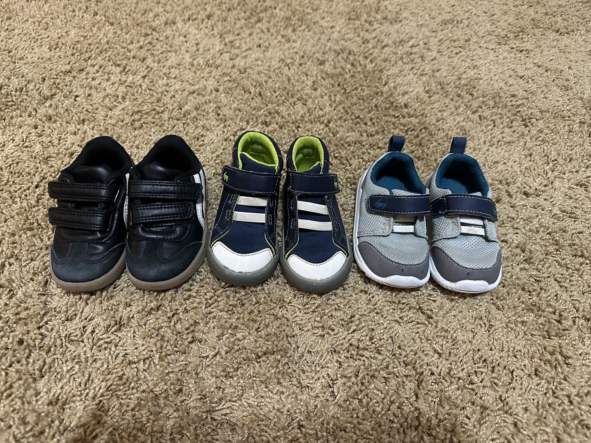 Show lot in 5T for toddler boys. Includes navy blue See Kai Run high top sneakers, See Kai Run grey Stryker sneakers, & Cat & Jack black retro sneakers. Used in playgrounds with general wear & tear, but have tons of life left. Straps and Velcro all work.