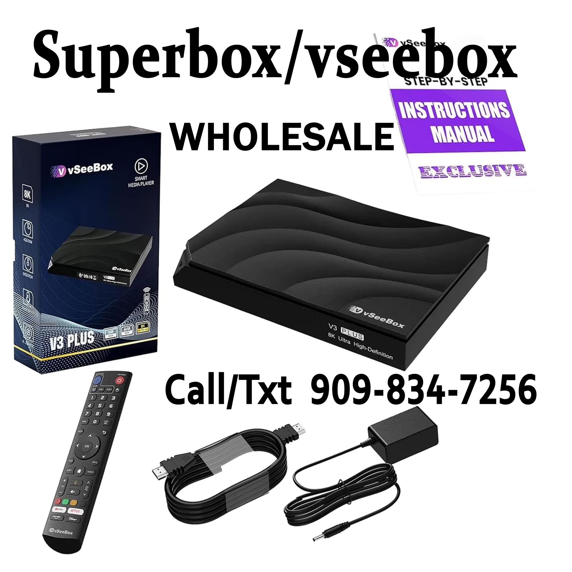 All-New Superbox S7 Max S7 Pro Superbox S6 Pro Max Ultra VSEEBOX ELITE ULTRA VSEEBOX V6 PLUS VSEEBOX V6 Max VSEEBOX V3 PLUS VSEEBOX ELITE MINI Experience next-level entertainment with our most powerful device ever. Featuring 6K resolution and the lightning-fast Cortex-A53 processor. Local pickup in Baldwin Park Ca!! Available with Lowest prices and price match guaranteed. Ask us about WHOLESALE prices. VSEEBOX V5 PRO 1 BOX $200 2-5 BOXES $195 UNITS 6-9 BOXES $185 UNITS 10+ BOXES $175 UNITS 20 BOXES $170 UNITS More than 20 contact us for wholesale specials New Arrival 2025 Edition 💥VSEEBOX V6 PLUS ( 6 apps multi split screen ) NEW INSTOCK 🔥 1 BOX $280 2-5 BOXES $270 UNITS 6-9 BOXES $260 UNITS 10+ BOXES $250 UNITS 20 BOXES $240 UNITS More than 20 contact us for wholesale specials New Arrival 2025 Edition 💥VSEEBOX V6 MAX NEW INSTOCK 🔥 1 BOX $250 2-4 BOXES $240 UNITS 5-9 BOXES $230 UNITS 10+ BOXES $220 UNITS 20 BOXES $210 UNITS More than 20 contact us for wholesale specials New Arrival 2025 Edition 💥VSEEBOX ELITE MINI (15 apps) - 1 unit $300 - $250 WHOLESALE PRICES 💥Vsee Elite Ultra. (21 apps) - 1 unit: $340 - Wholesale prices inquired New Arrival 2025 Edition 💥S7 PRO. 32Gb Storage - 1 unit: $190 - 2-4 units: $180 - 5-9 units: $175 - 10+ units: $175 - 20+ units: $170 - 40+ units: $160 New Arrival 2025 Edition 💥S7 Max. 64Gb Storage - 1 unit: $200 - 2-4 units: $195 - 5-9 units: $190 - 10+ units: $185 - 20+ units: $180 - 40+ units: $170 New Arrival 2025 Edition 💥S7 Ultra. 128Gb Storage - 1 unit: $220 - 2-4 units: $215 - 5-9 units: $210 - 10+ units: $205 - 20+ units: $200 - 40+ units: $180 💥S6 PRO. 32Gb Storage - 1 unit: $135 - 2-9 units: $130 - 10+ units: $125 - 20+ units: $120 💥S6 MAX. 64Gb Storage - 1 unit: $165 - 2-3 units: $160 - 4-9 units: $150 - 10+ units: $145 - 20+ units: $140 💥S6 ULTRA. 128Gb Storage - 1 unit: $180 - 2-3 units: $175 - 4-9 units: $170 - 10+ units: $150 - 20+ units: $145 💥SuperBox has 1 year manufacturers warranty 💥Store business hour💥 💥Location: 4219 alderson ave unit C. Baldwin Park 91706, CA 💥 Mon-Sun 10 AM - 5 PM, Call/Text Us Now (909)834-7256 Free Lifetime Updates: Powered by 4GB of RAM and 64GB of storage, this device is a multimedia powerhouse. Enjoy ultra-fast streaming with support for a 1000Mbps Ethernet connection, dual-band WiFi, and the latest WiFi 6 technology. Plus, the upgraded Bluetooth remote with voice command makes navigating your content easier than ever. Content - 6K Media Player - Android TV Box - Free Lifetime Updates - Home Entertainment - Online Content Don't miss out on the chance to transform your living room into an entertainment paradise. Take the plunge into the future of the SuperBox S7 Max Media Player today!