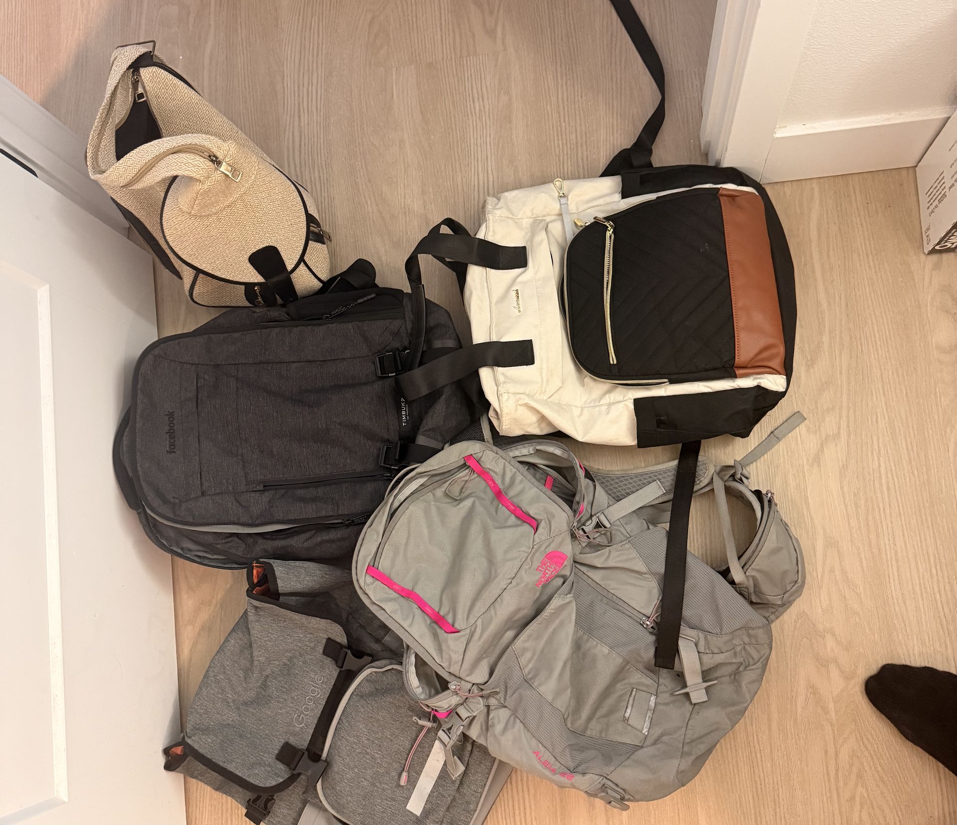 Bags (3 laptop bags (facebook, google), 1 north face hiking back pack, 1 backpack/purse