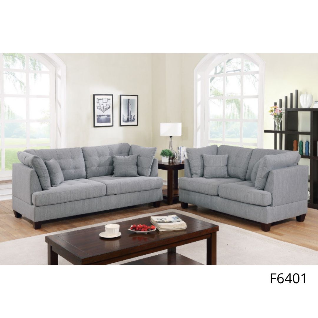 Sofa & Love Seat Item # F6401 Color: Grey Available in Black Coffee, Grey and Warm Purple Materials: Polyfiber (Linen-Like Fabric) Solid Pine Frame and Wood Legs Dimensions: Love seat: 62″ x 34″ x 35″H ; Sofa: 75″ x 34″ x 35″H Some Assembly Required