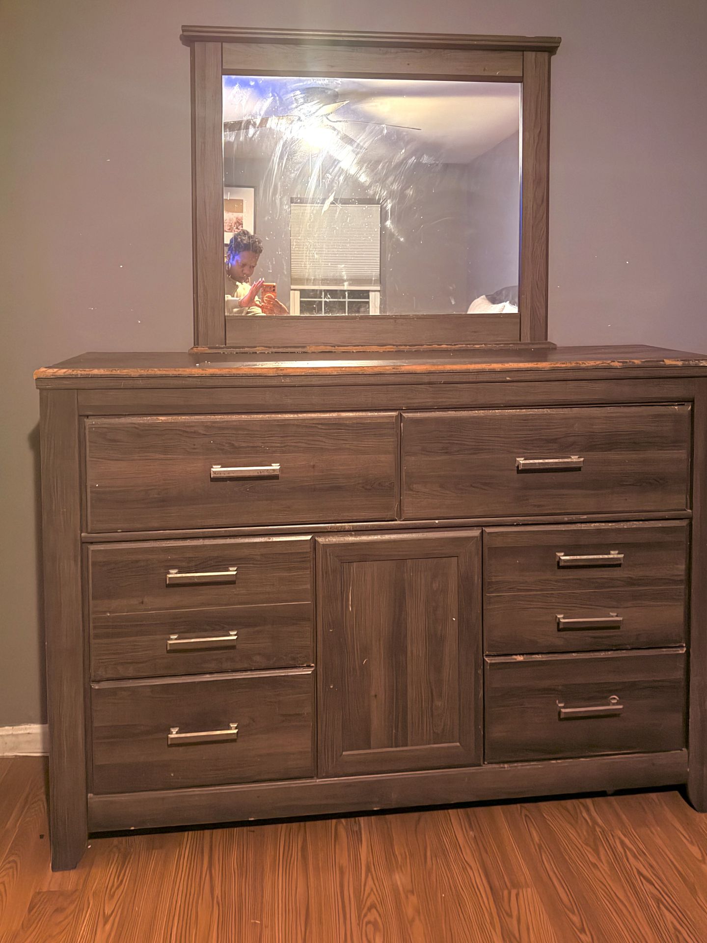 Upgrade your space with this stylish rustic bedroom set β perfect for anyone who loves a warm, natural wood look! πͺ΅ Includes: β’ Dresser β’ Mirror (no cracks, great condition) β’ 2 Nightstands All drawers open smoothly (tracks fully intact) β’ All handles/knobs included and secure β’ Mirror is clean and damage-free β’ Solid, sturdy furniture β¨ Condition: There is visible wear and tear on the wood, but it adds a beautiful rustic, vintage character β perfect if you like that distressed look!