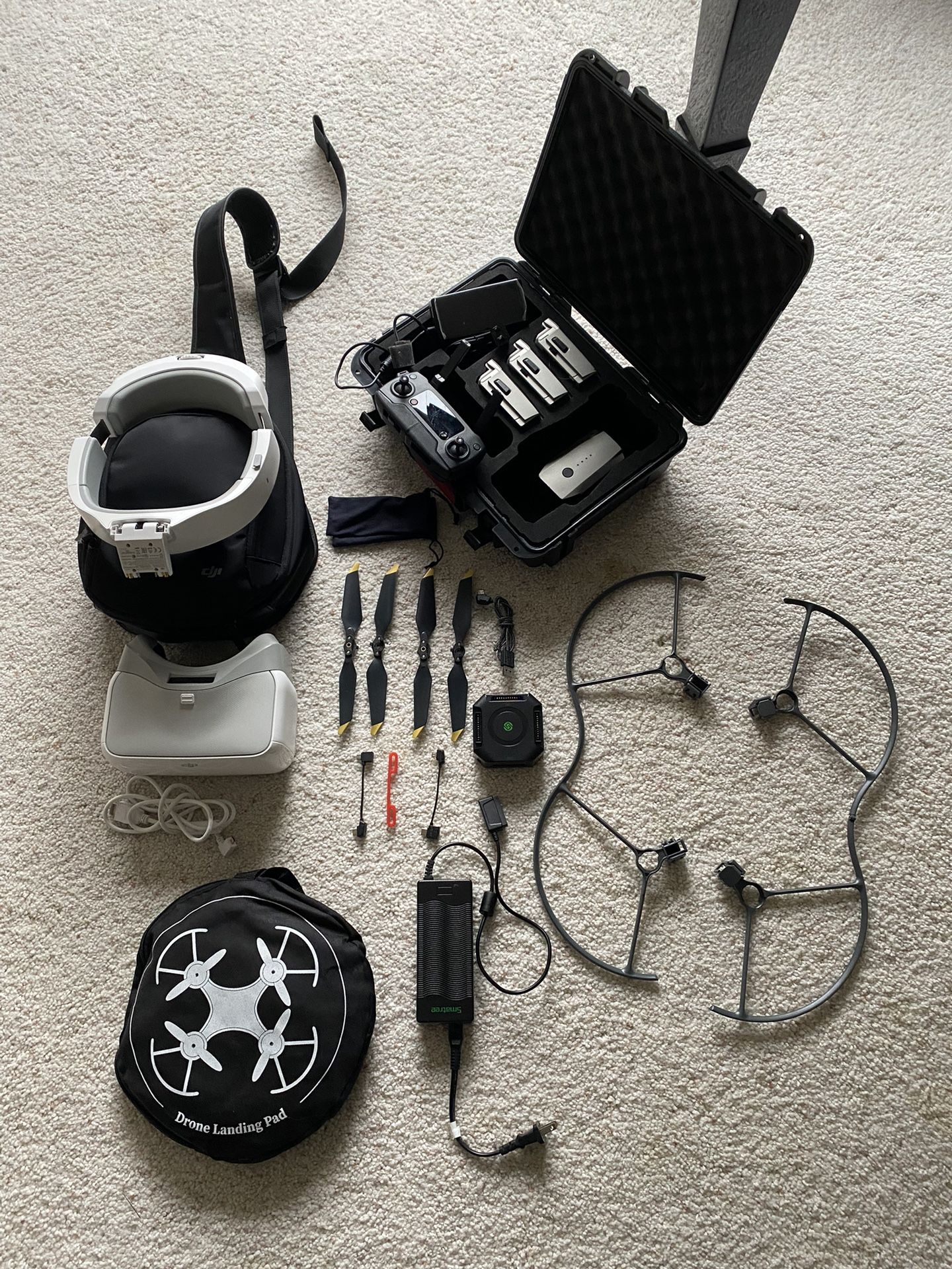 DJI Offer Up Pricibg •Batteries x4 @ $35 ea = $140 •DJl Mavic pro Hard case $25 •Original Mini 3 Series 360° Propeller Guard For DJI Pro Drone Indoor $20 •Propeller Guard for Mavic $10 •DJI Landing Pad $5 •DJI Goggles $75 •Smart Tree multi battery and accessory charger $25 • DJI Propellers x4 Free Total bundle value over $600 Your price $300 (reasonable offers accepted) 凸 分