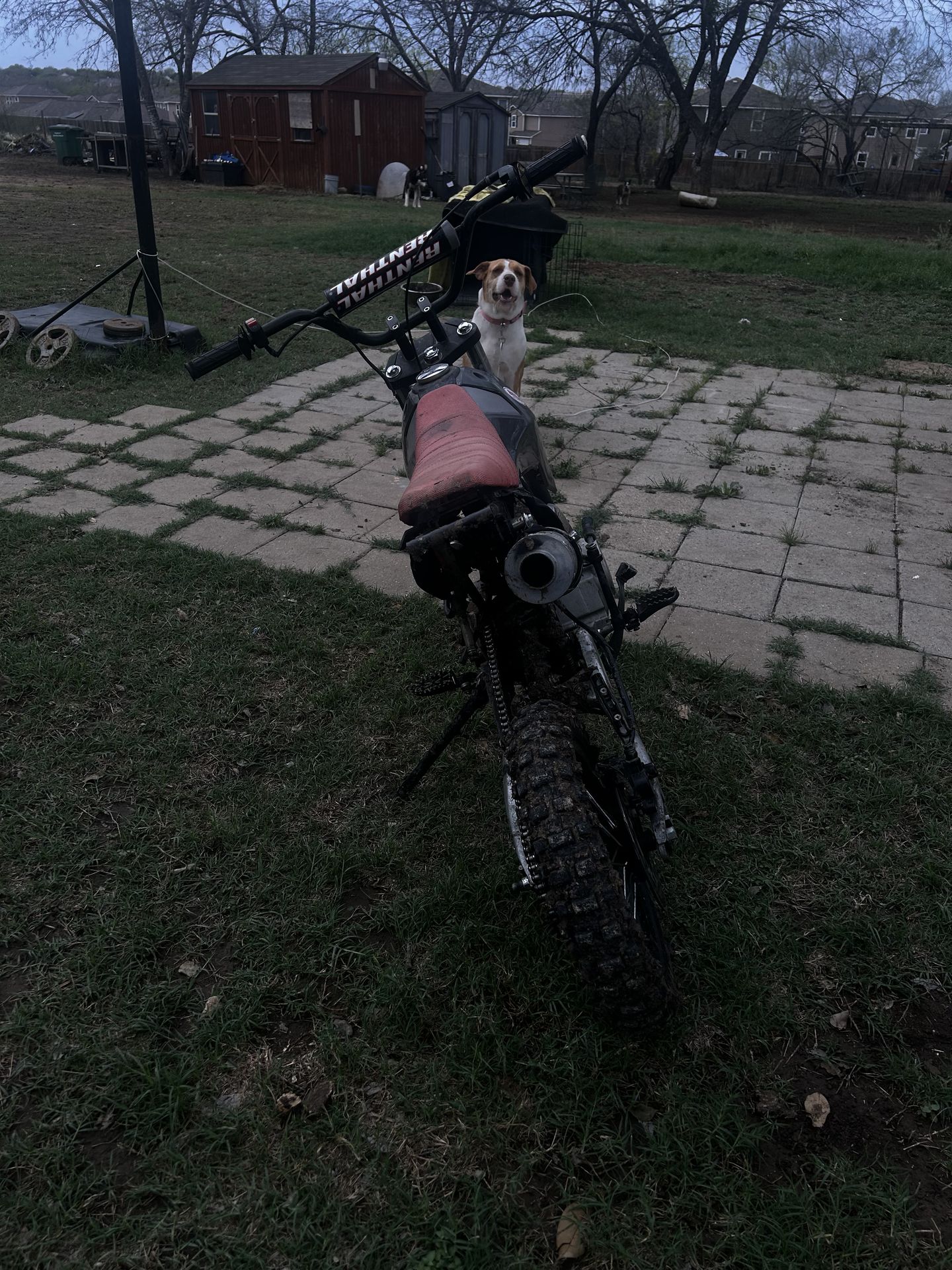 110cc dirt bike. New back tire. Starts and runs strong. Missing back fender flaring. New oil change and ready to ride. 4 speed semi auto, you chafe the gears with left foot and no clutch. Great for new riders to gain experience. No LowBalls Will trade for minibike