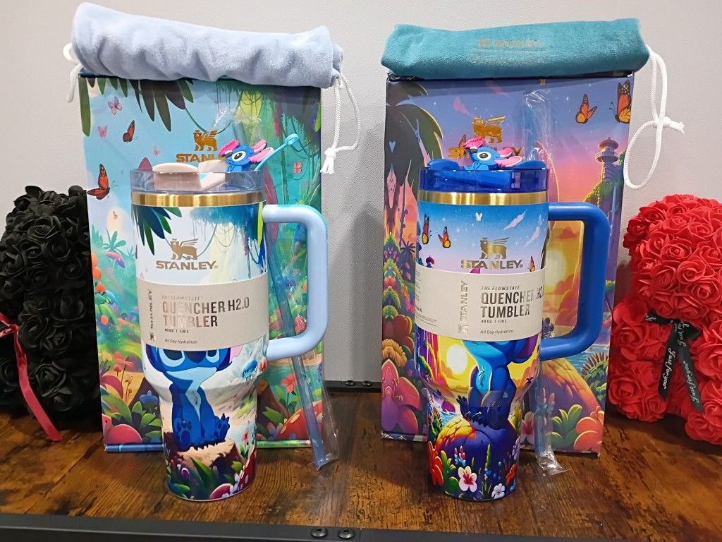 I have two dark blue and one light blue of the limited edition stitch Stanley's They each come with a straw charm and the Love sack from Stanley. And the memory box.