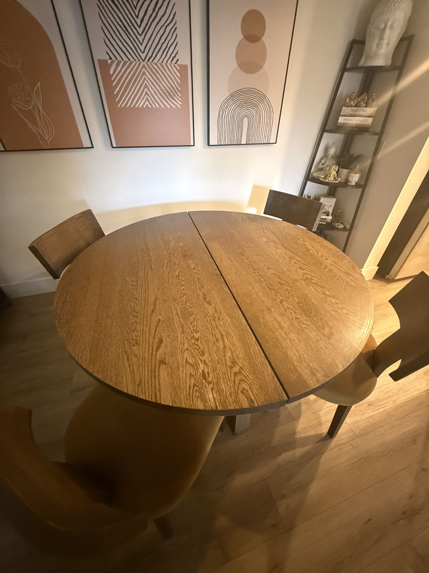 Minor scratches from moving (picture with scratches attached) 4 farmhouse wooden orange chairs Willing to sell table and chairs separately. $400 table $100 for the set of 4 chairs