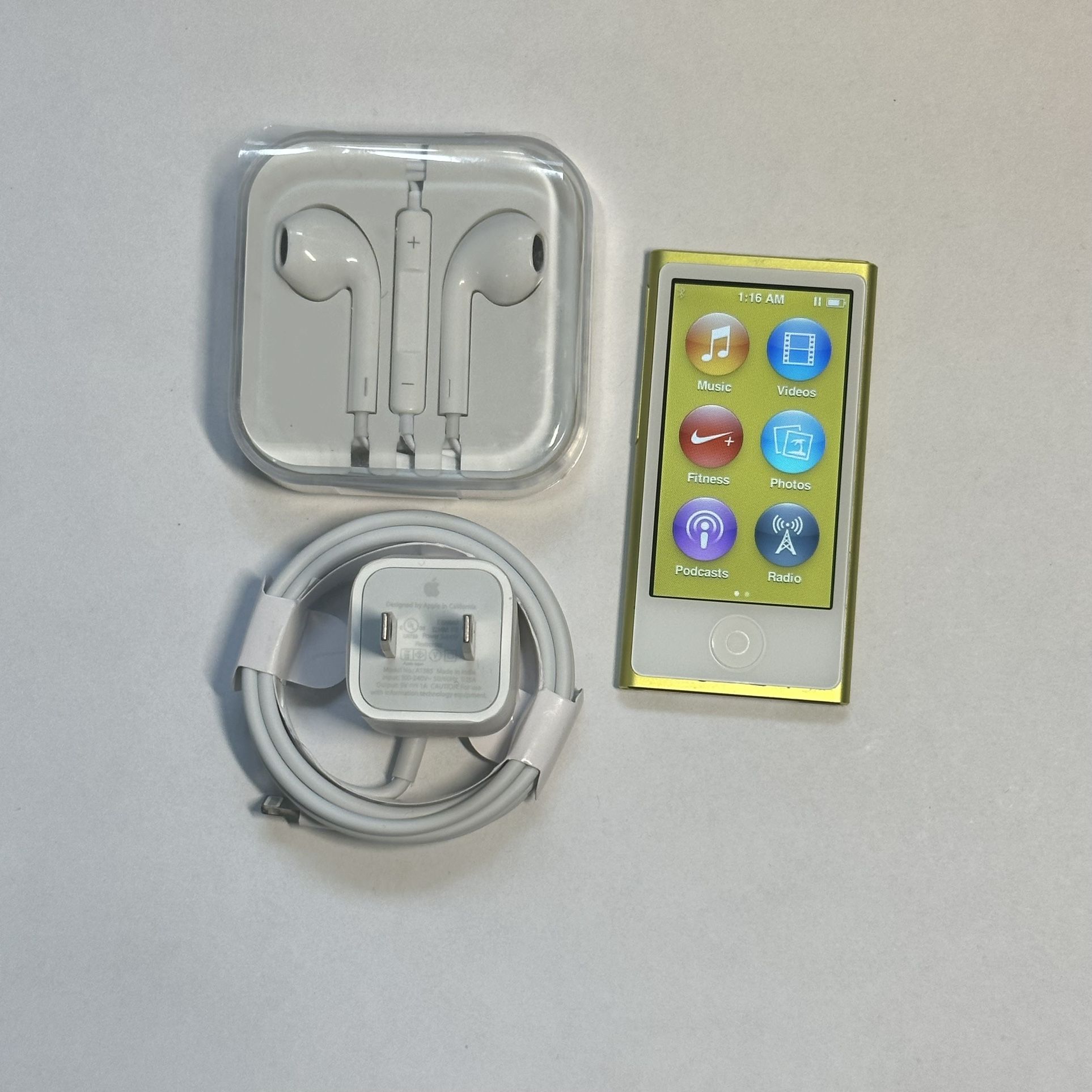 Device Condition is working normally. Good overall condition. All buttons are working properly. LCD and digitizer are in good condition. Bluetooth Battery Performance Plays approximately 9 hours of music without shutdown. A good quality new battery typically plays around 10-11 hours, but these are difficult to find. Test was performed at maximum volume. Battery life may be longer with lower volume. Bluetooth usage may also affect battery performance. Estimated performance is approximately 85% compared to a new battery. Storage 16GB (approximately 3,000 to 4,000 songs depending on file size and quality) Color Yellow Connectivity Bluetooth What's Included Charger and cable included Headphones included Important Notes This is a used vintage Apple iPod Nano 7. Battery performance was tested under real usage conditions. Actual battery life may vary depending on volume, Bluetooth usage, and screen activity. Please review all photos carefully for the exact cosmetic condition.
