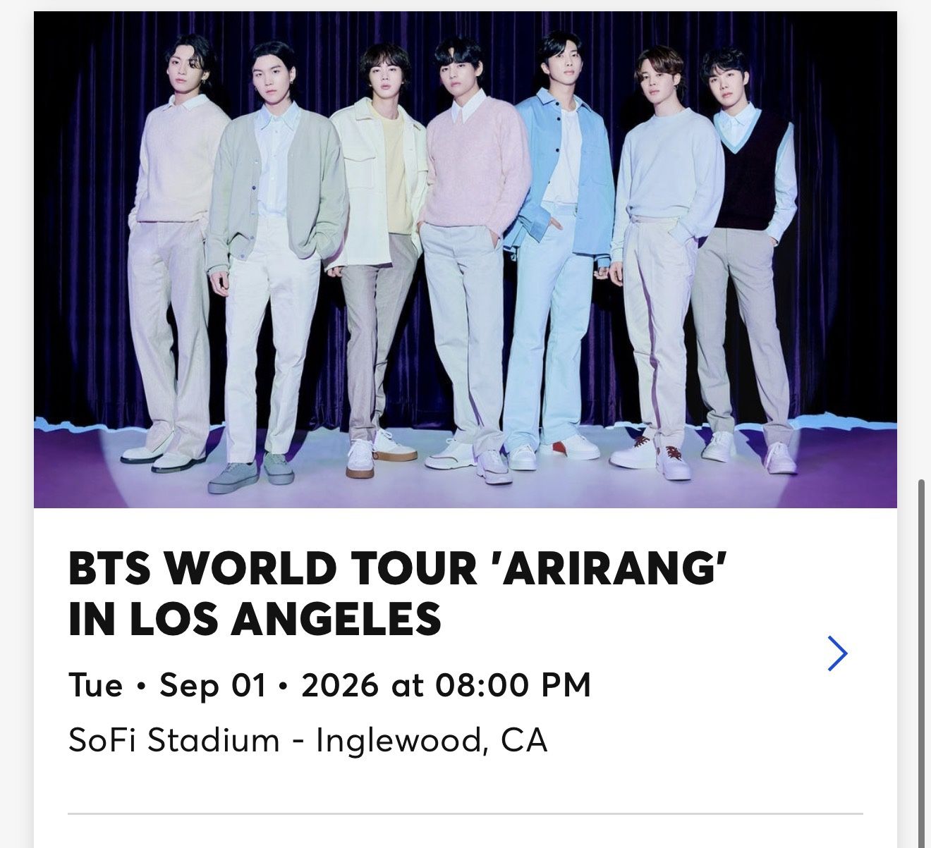 WTS BTS Tickets SEP 1 - SOFI STADIUM - INGLEWOOD Section 455 - Row 1 - Seats 16 & 17 $200 each Meet up in Korea town Los Angeles