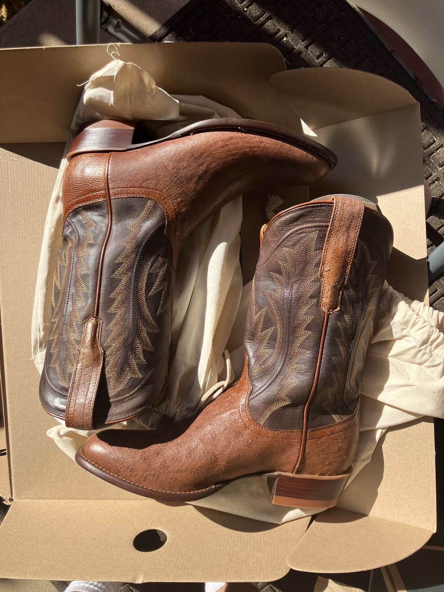 Size 8 Men’s smooth ostrich boot. Only worn twice. Original box & boot bag included.
