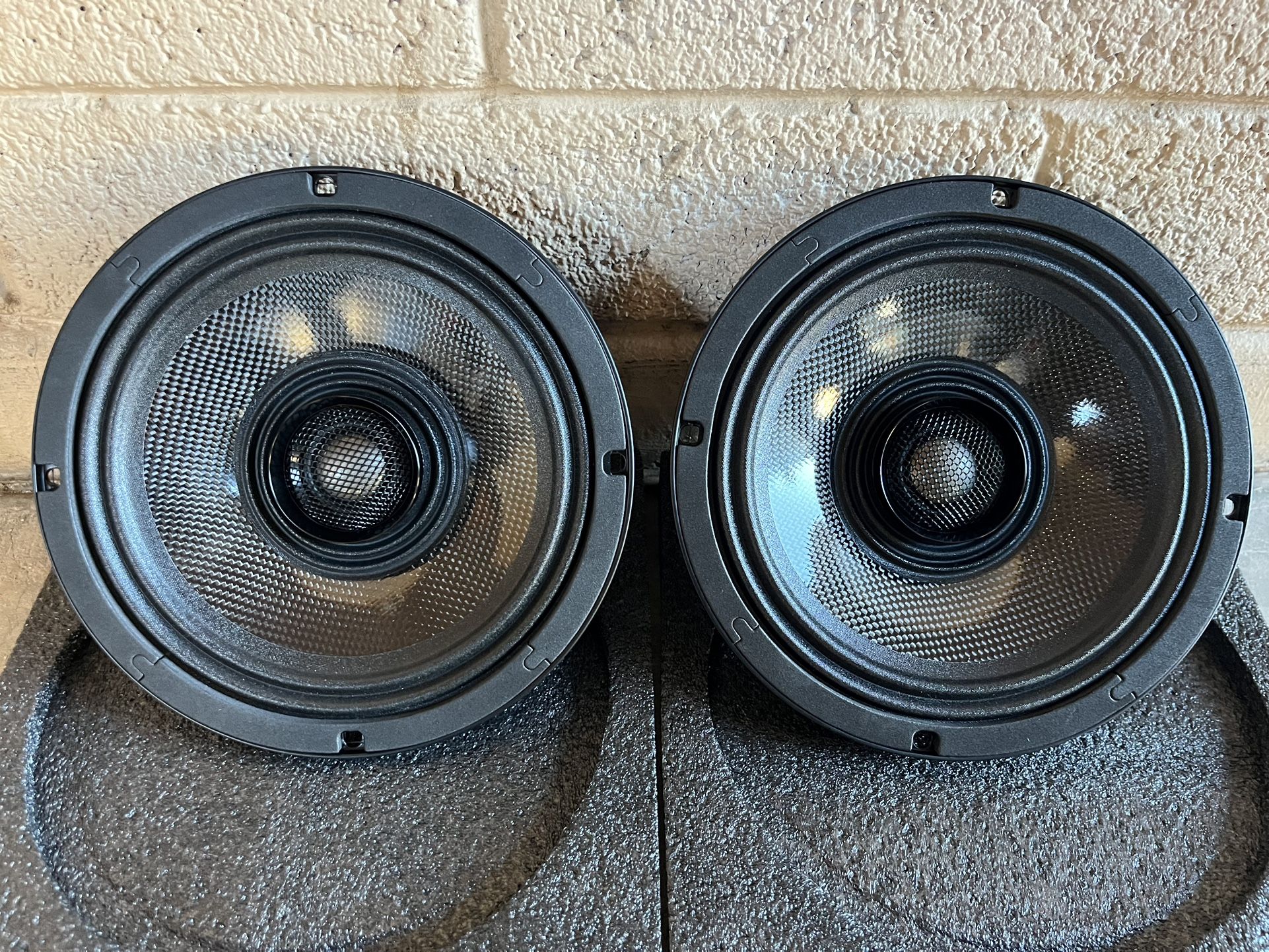 Extremely loud & powerful 8 inch neodymium midrange speakers . Carbon fiber cone 2 inch silk dome tweeters Dual inputs 2 inch copper coils 500rms watts each /1000rms total watts Neodymium magnets These speakers are super Loud & Clear on amplifier power