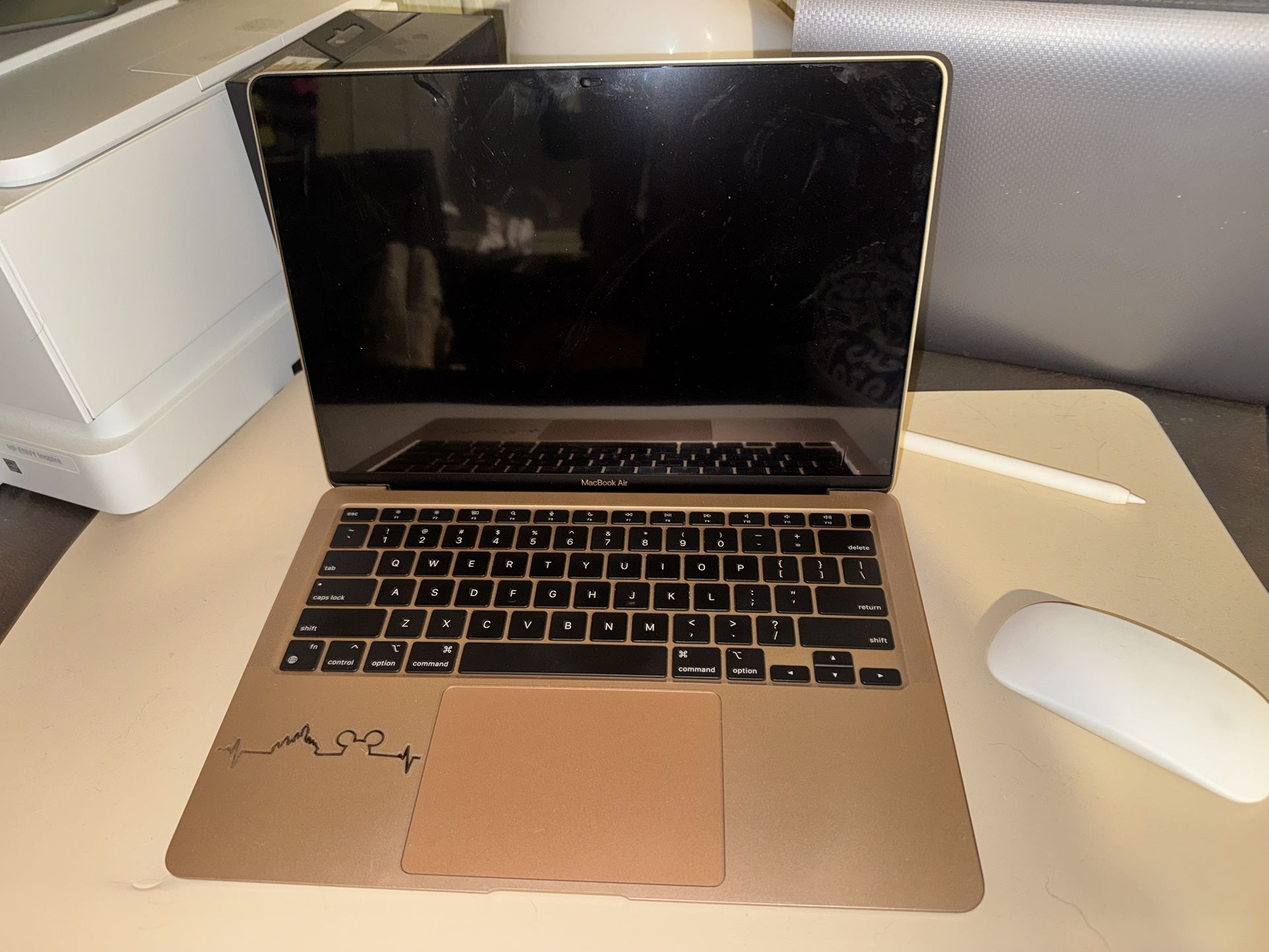 13 inch MacBook Air with M1 chip Color - Gold Magic Mouse Laptop Sleeve I bought this in 2022 with the intention of using it for work and school. In reality I’ve hardly used it and would match rather like an iPad. No scratches or blemishes. It is in perfect condition.