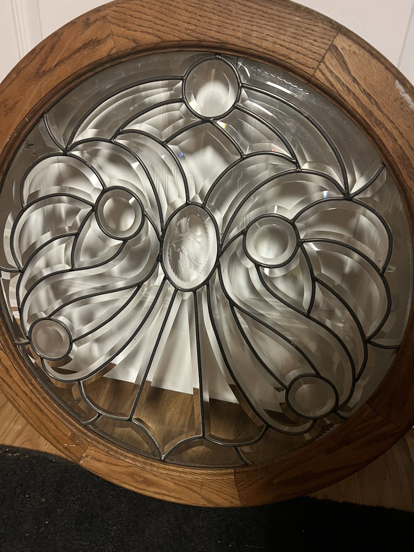 Let the beautiful design from this leaded & beveled glass pour light into your space!! Hang this in a window or an accent on a wall. It is heavy too. It is about 29 inches across with oak trim around it but can be painted to match your decor. An eye-catching masterpiece!!!