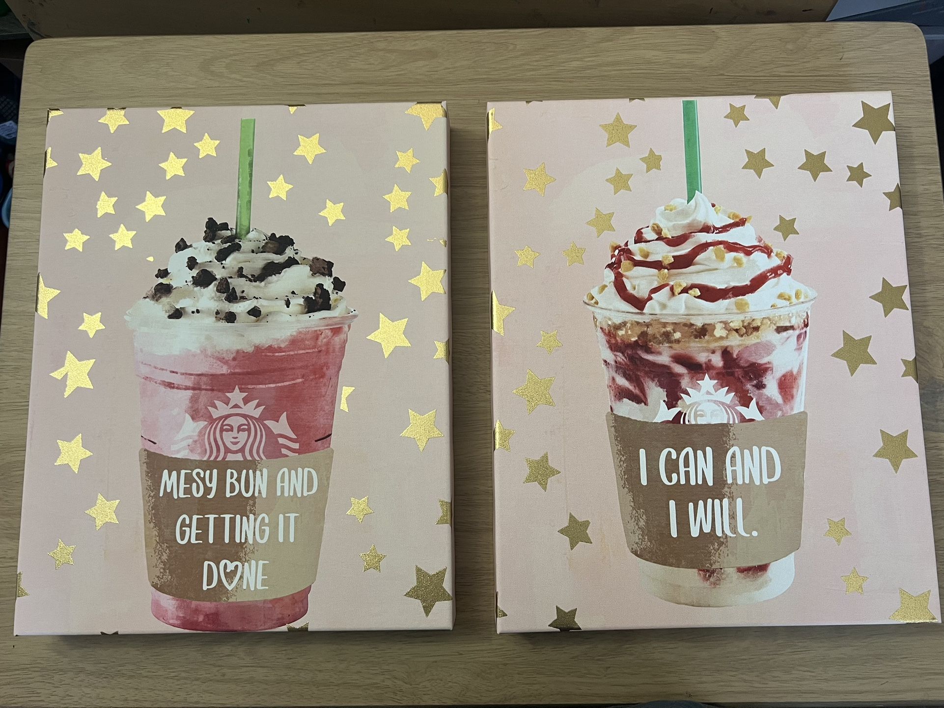 Starbucks coffee pink Frappuccino drinks wall picture frames. Pink & gold Used for craft room. Like new! Super cute canvas girly girls decor 14h x 11w both for $15