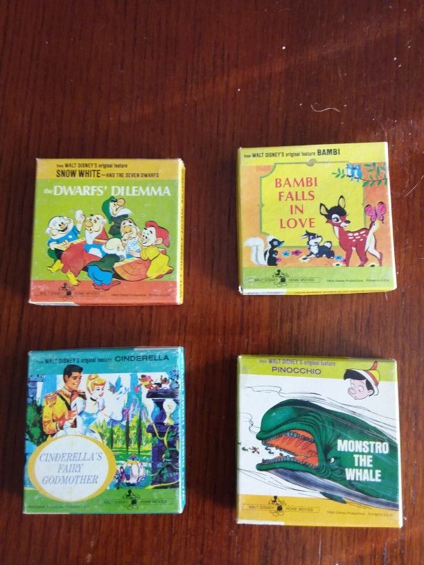 Four Disney movies for sale. 8 mm shorts from the 60s or 70s. I've never viewed them oh, they've always been in their boxes. Appear to be in excellent condition. Great collectible for Disney fans. I do not have a projector for sale. Dave G