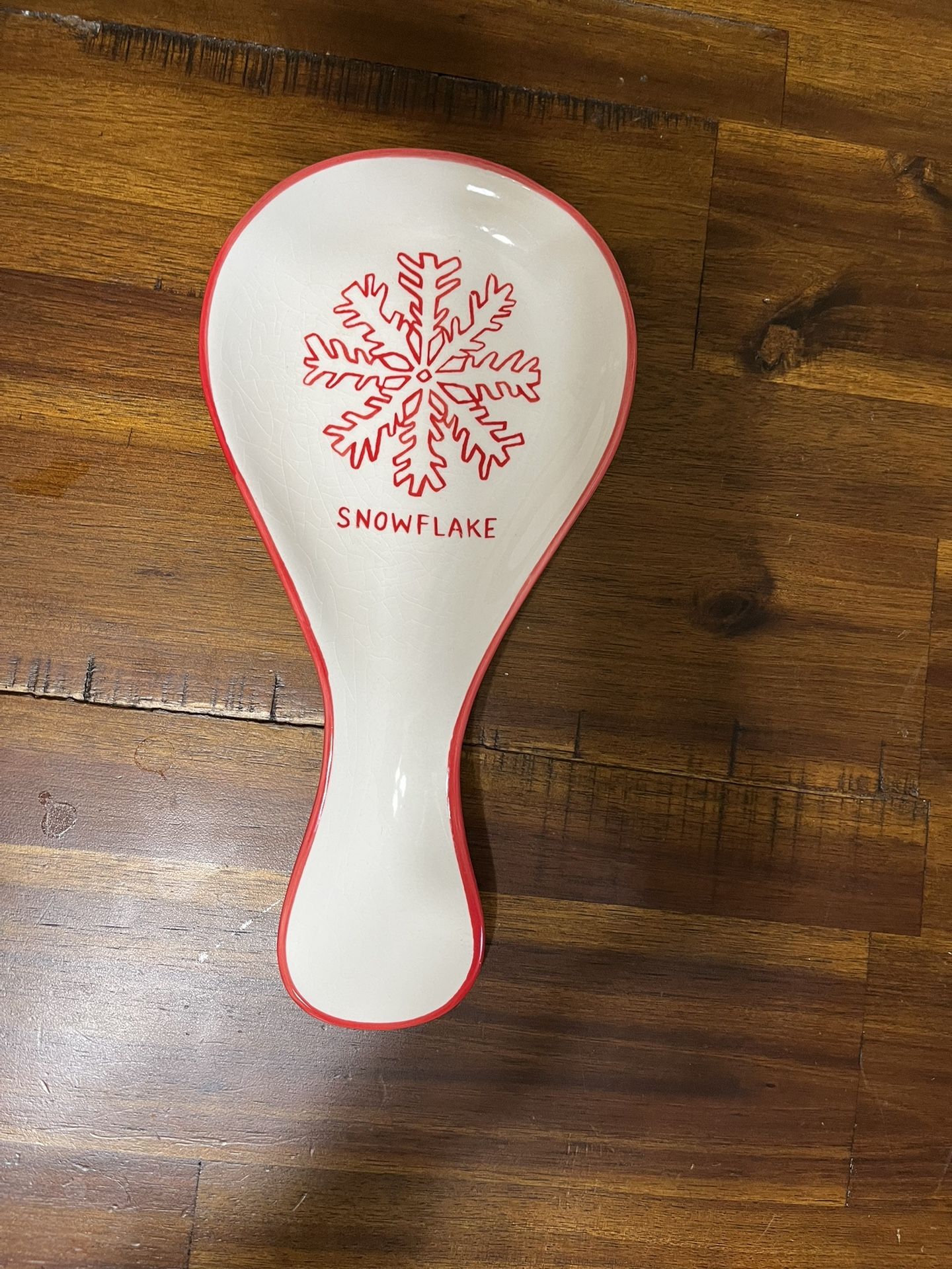 Molly Hatch spoon rest for Anthropologie. White with red pinstripe and snowflake. No chips or cracks but has some crazing. Size 10”x5”.