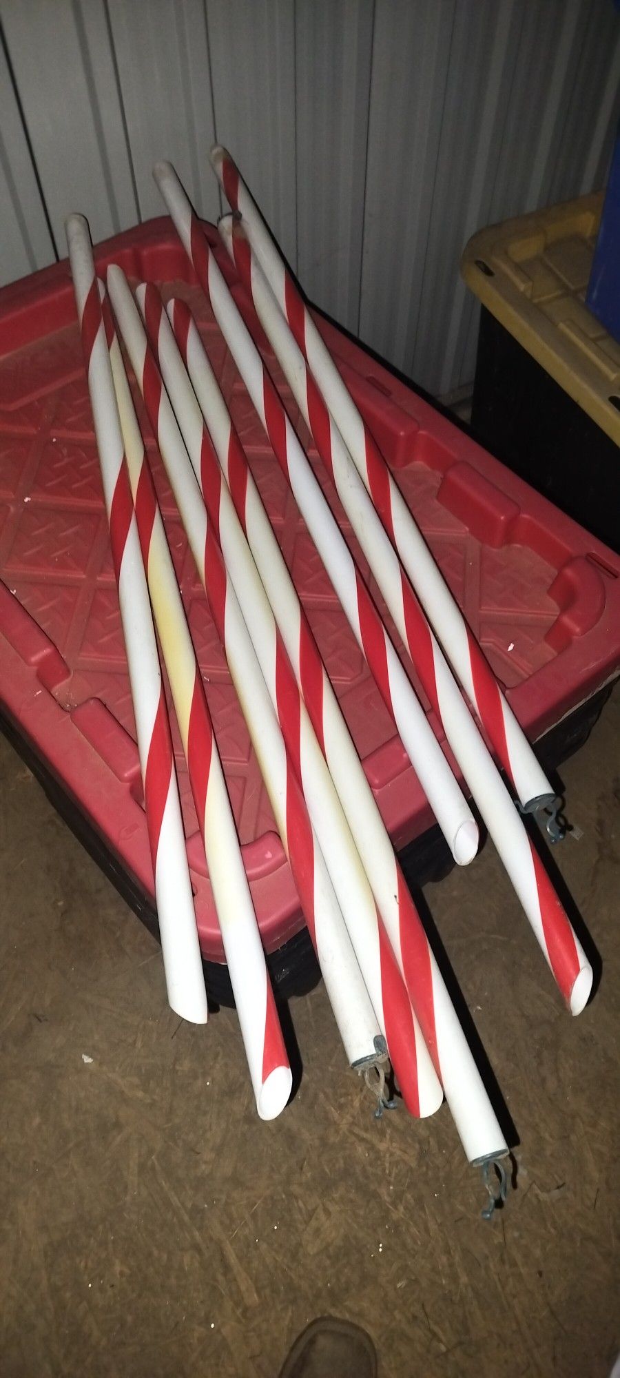 These are yard stakes(end cut diagonally for staking)about 3' tall for stringing lights on .There are 8 of them. A few are missing the 'light clip' from the top. I think they would look better with the lights IN them & strung from 1 to the next(removing the 'clips' from them all) instead of just running along from top to top.