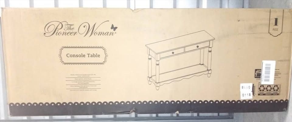 New in Box The Pioneer Woman Wood Helen Console Table Color: Heirloom Brown Ideal for entryways, hallways, or behind couches Console table measures 47.5" L x 15.5" W x 30.25" H Materials: wood Assembled weight: 59.52 lb