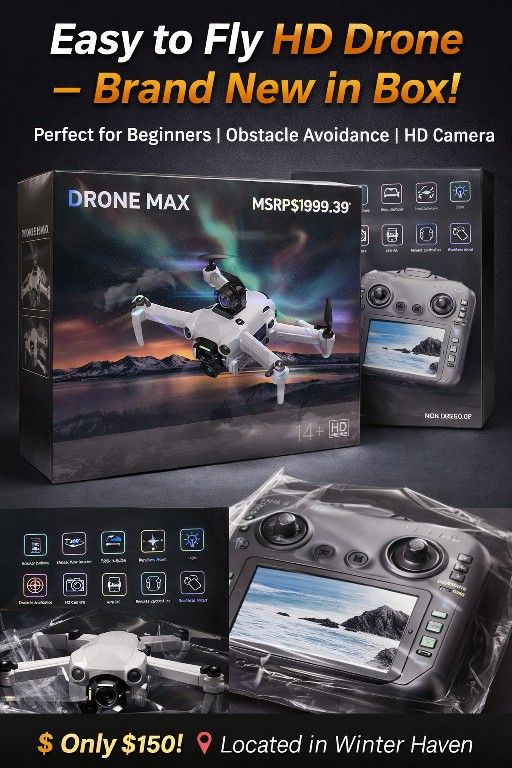 Drone Max HD Camera Drone – New (Sealed in Box) Brand new Drone Max drone, still factory sealed. Clean, complete setup ready to go. ✔️ HD 1080p camera for aerial photos & video ✔️ Remote controller with built-in display ✔️ Smooth, stable flight design ✔️ Perfect for beginners or casual flying 💲 $150 📍 Winter Haven Serious inquiries only
