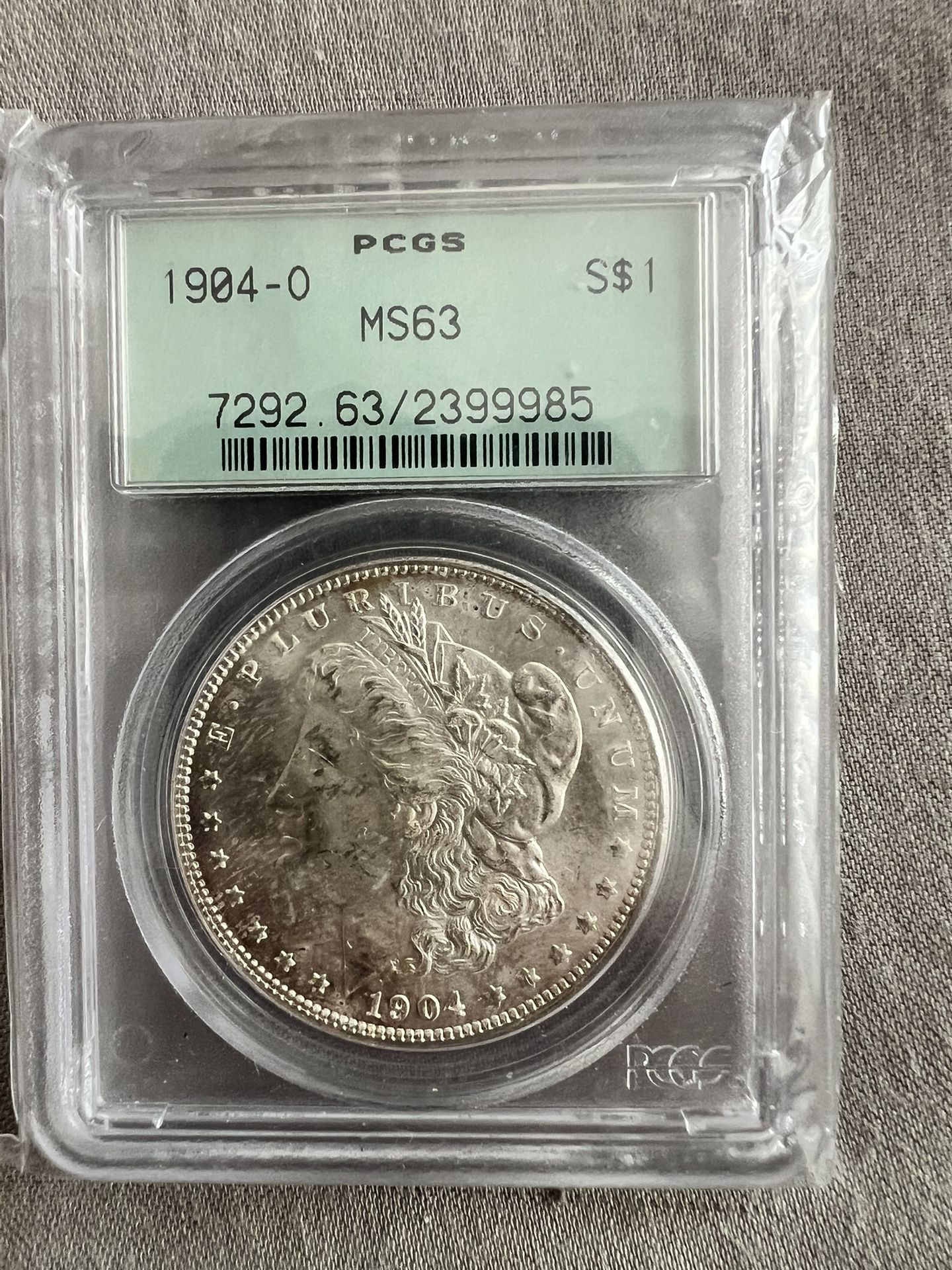This is for the old green holder 1904-O Morgan silver dollar graded by PCGS in MS63. Firm