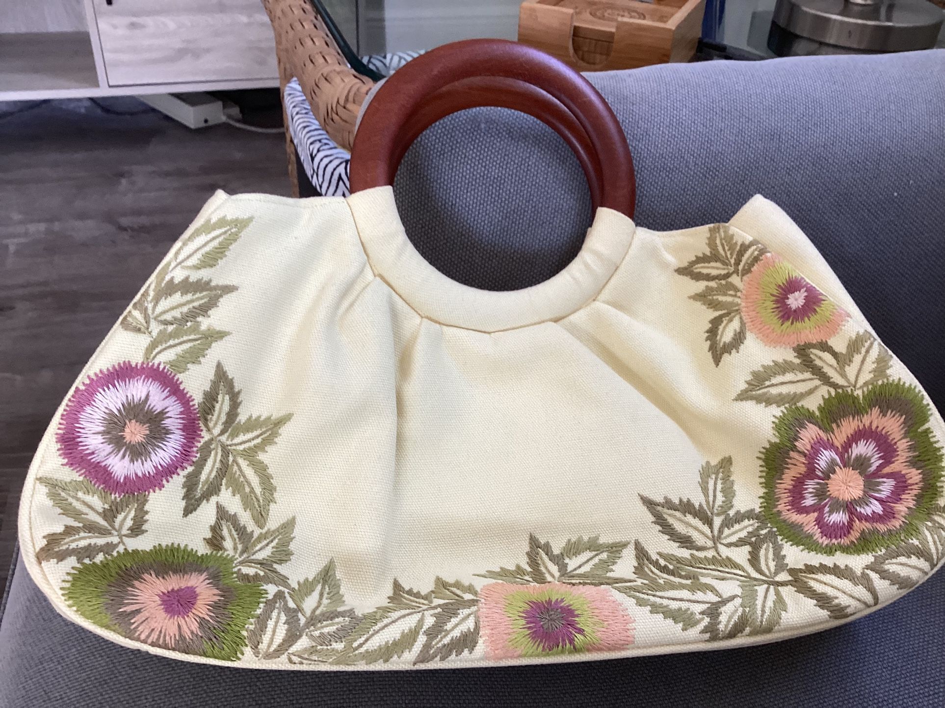 Vintage DV Collection Yellow embroidered purse wooden handle All monies used buy new toys new clothes children in FL why pay more questions Umarked. Assume maybe 1960’s unable find year of any facts on this one of a kind purse. Handle looks like cherry wood Size width 16” height 12” again excellent condition questions Excellent condition no stains no marks speak of tiy mark side see pix one of a kind