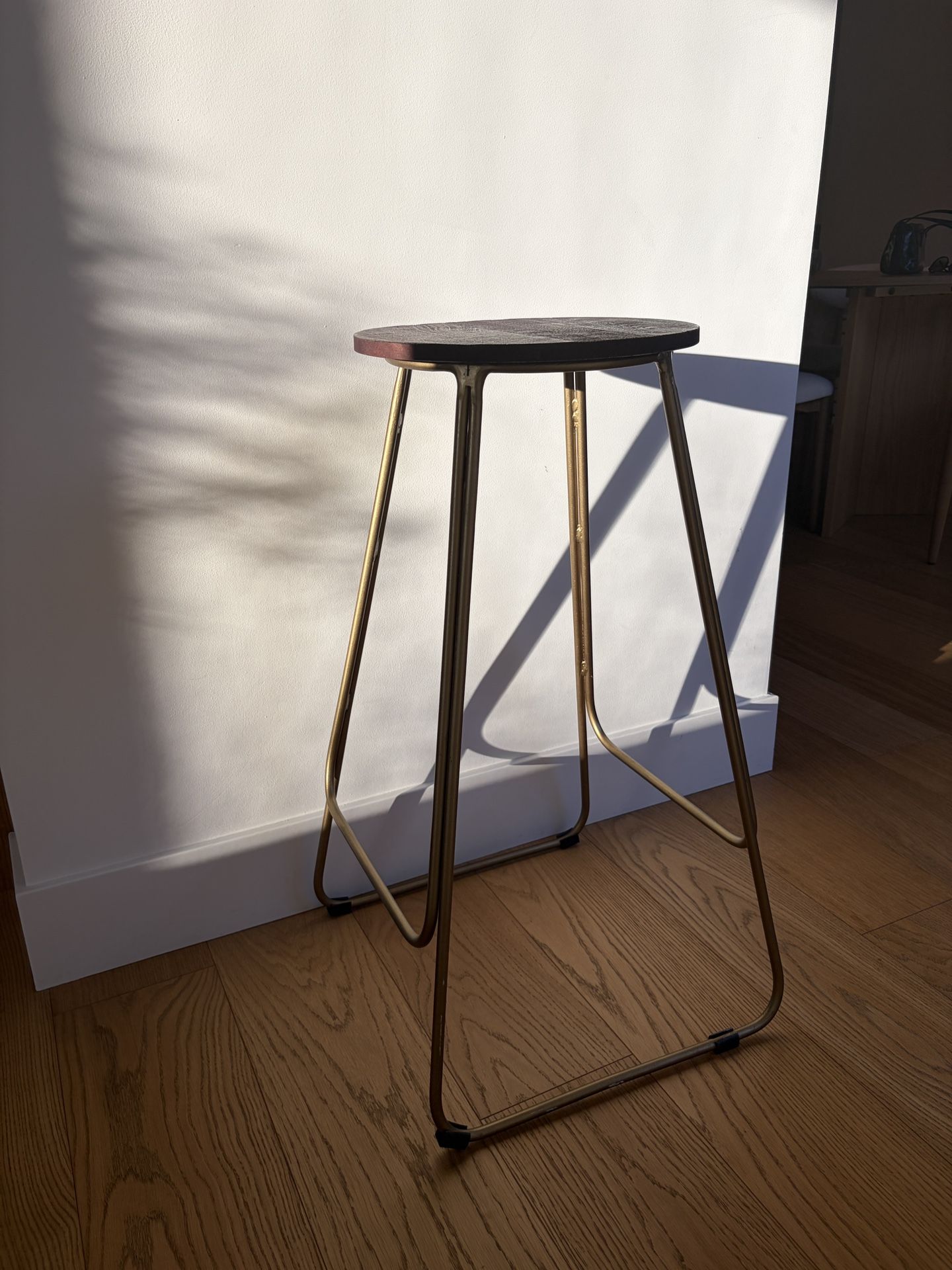 set of three modern and minimal counter stools the “joliet” bar stool from urban outfitters - now discontinued from their website but I have three and they are practically brand new and so lovely. sold as a set of three and not sold individually. we only had these a short time and have virtually no wear. i’m in the pasadena /highland park area. message me! product details: Boho-industrial tall bar stool with a natural mango wood seat and sturdy aged brass legs. Pull it up to a breakfast bar, use it on a covered patio or pair it with a high-top table for up-ing the efficiency of your space! Content + Care - Iron, mango wood - Wipe clean - Imported - Dimensions: 17"diameter base x 30"high with a round seat 13” diameter - Weight: 16.31 lbs