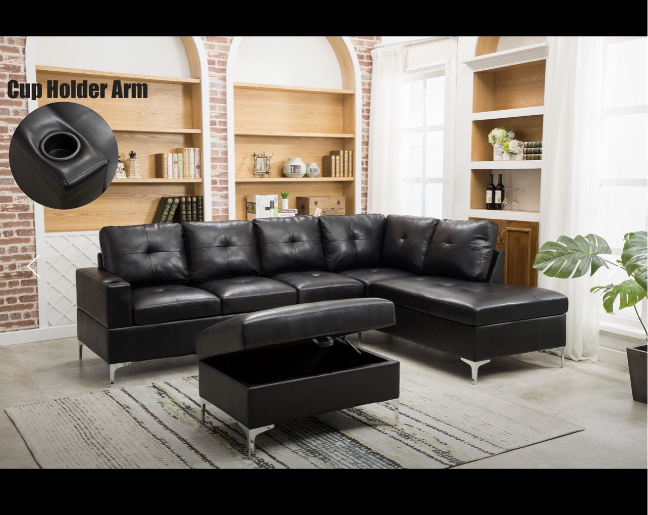 Black Leather Living Room Sectional With Ottoman - Delivery And Financing Available
