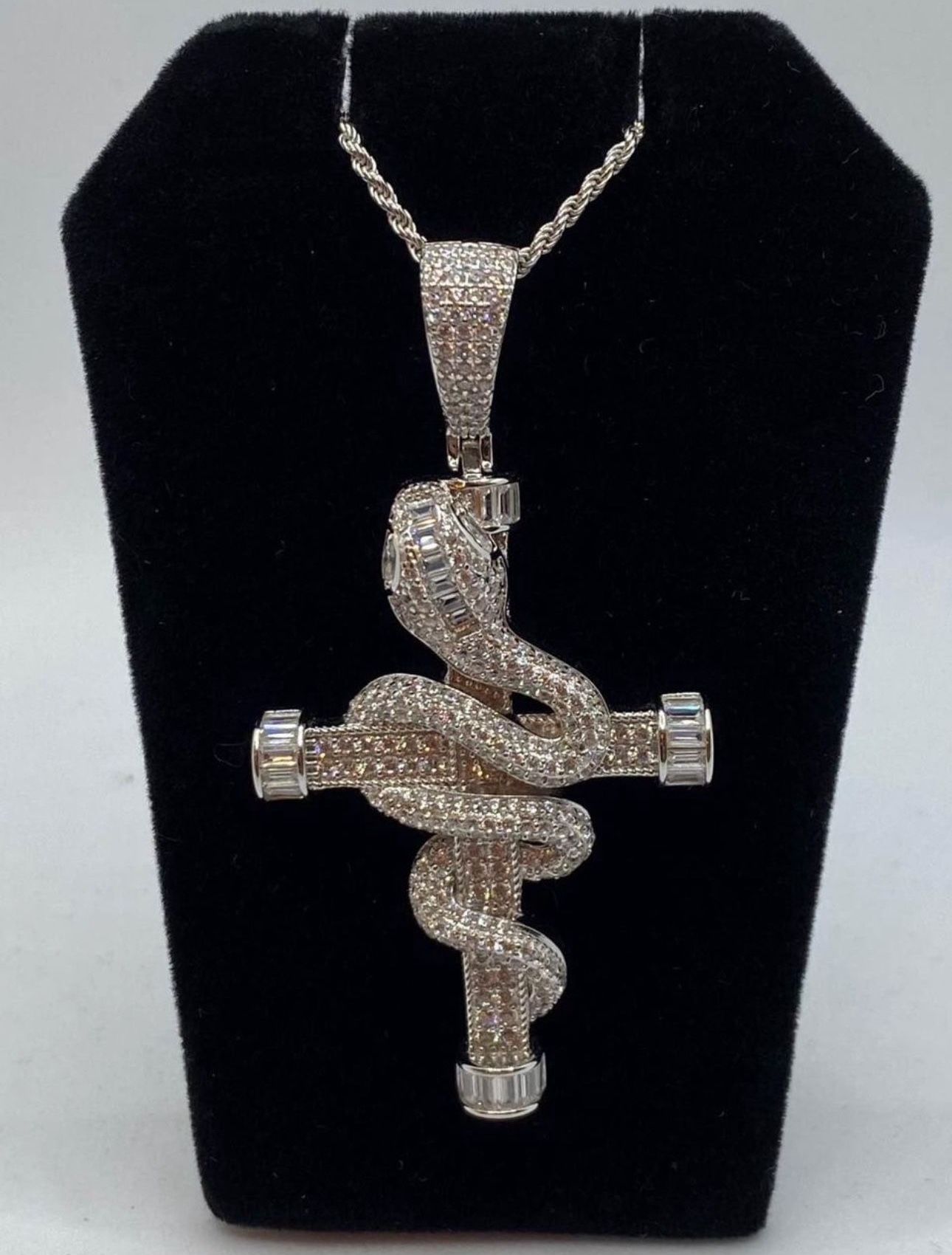 Cross snake pendant with Rope chain Pendant is 2.5” Chain is 22” 925 silver white gold plated Will not color fade