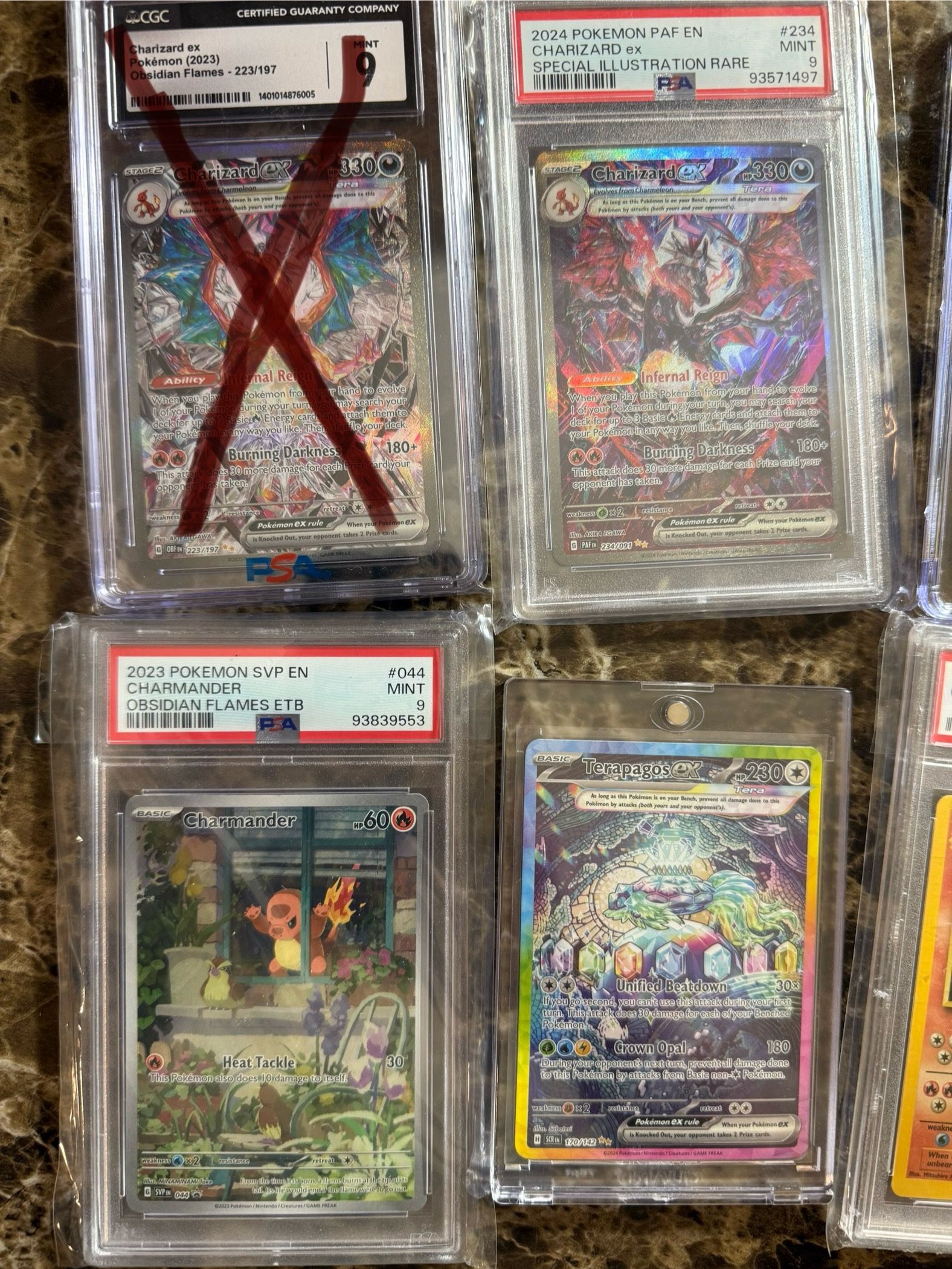 Charizard #234 psa 9 $200 Charizard #223 cgc 9 Sold Charmander #044 psa 9 $40 1999 chameleon #44 psa 8 $30 Lapras ex 158 cgc psa 10 sold Raichu 211/193 $40 Picachu 057/191 $7 Picachu 219/191 $SOLD Terapagos 170/142 $45 Lacey 172/142 $20 No trades cash or Apple Pay. Located south phx Prices are listed. Low offers will be ignored. Thank you for looking. Don’t waste my time or yours.