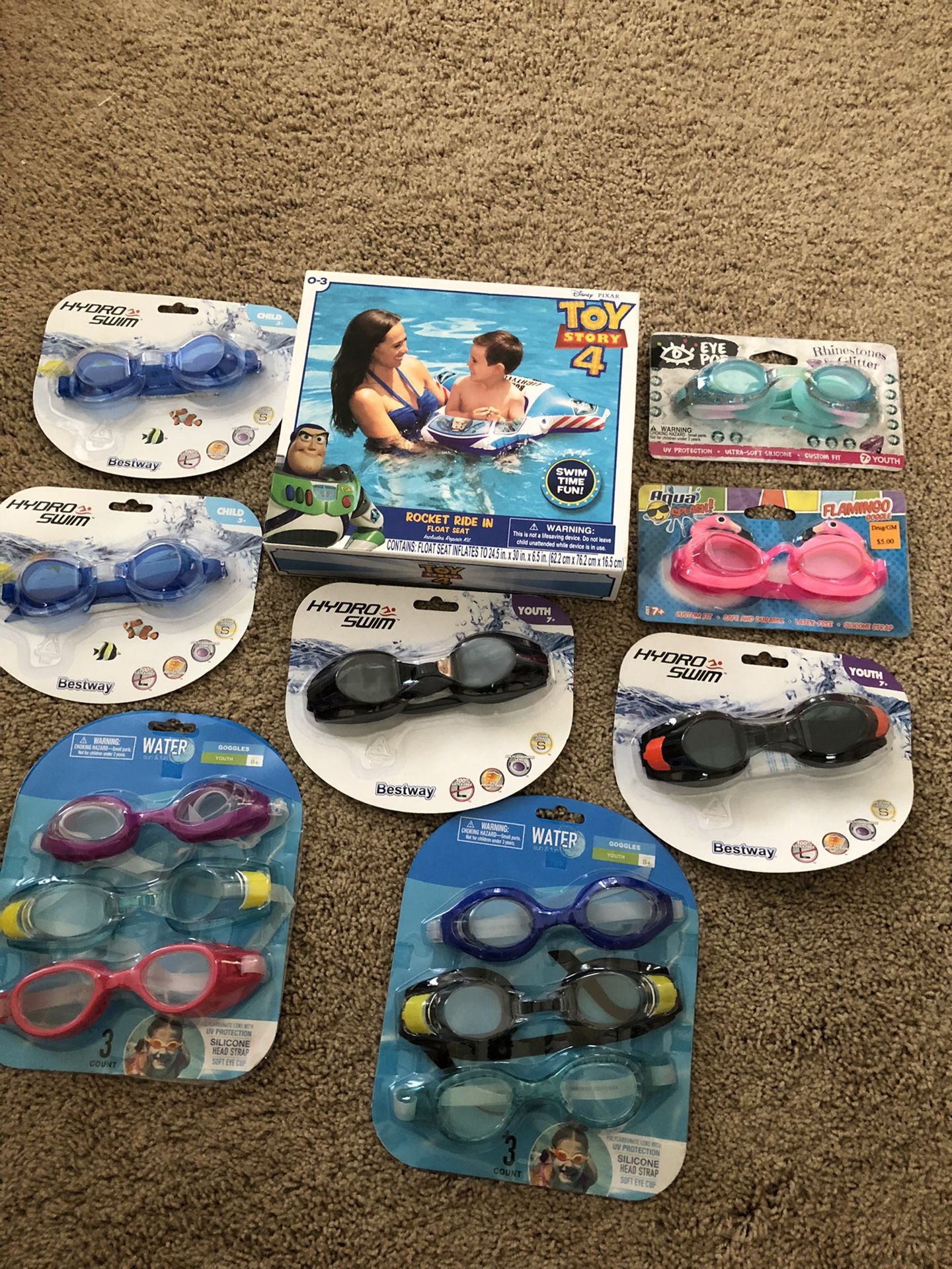 Toy story four rocket ride in Float seat and two packs of children’s goggles ages three and up, to swim goggles for youth ages seven up, one rhinestones and glitter Gaugle for youth 7+, One pink flamingo swim goggles for youth age 7+ and two packs of three youth age 8+ swim goggles. So a total Of 12 swim goggles and one rocket ride in Float seat for $20