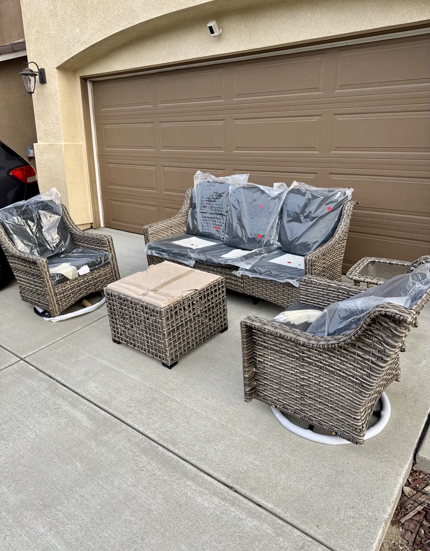 Gray return patio furniture set with black cushions. All brand new, assembled, and ready to enjoy! Chairs have swivel bottoms and coffee table has a glow solar light.