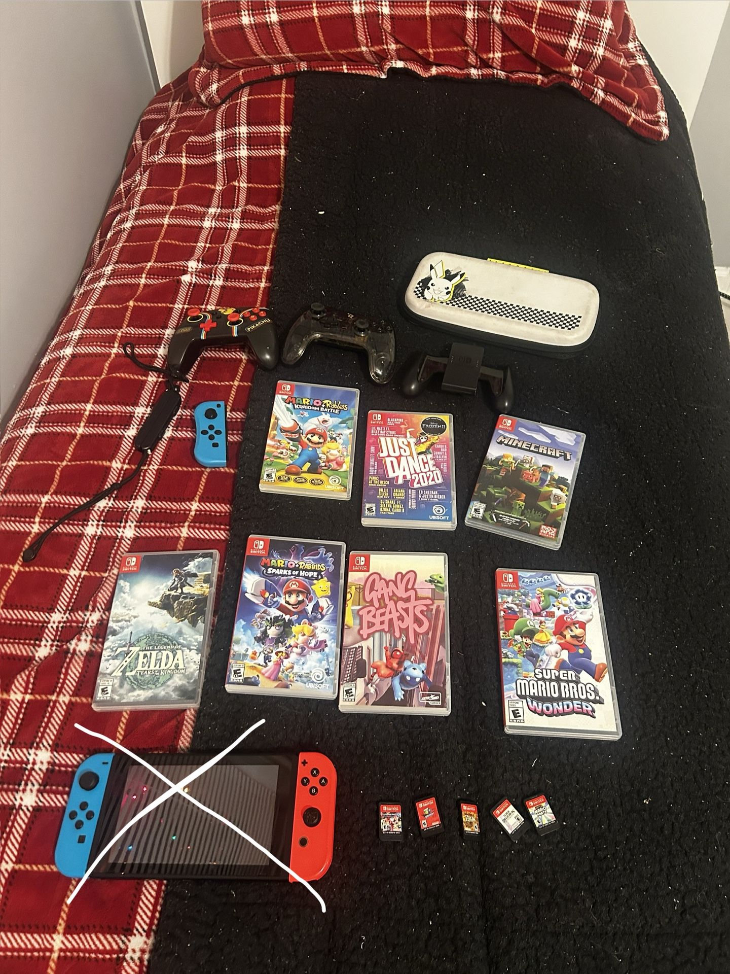 Nintendo switch needs repairs comes with the straps and controller holder and extra joycon $55 (sold) Legend of Zelda breath of the wild $45 Legend of Zelda tears of kingdom $55 Mario+rabbids $20 Mario+rabbids sparks of hope $30 Super Mario bros wonder $45 Gang beasts $25 Just dance 2020 $20 Minecraft $20 Mario kart 8 $45 Super Mario odyssey $45 Super smash bros ultimate $45 Super Mario party $25 Both the controllers $25 Case $5 If you have any other offers dm me