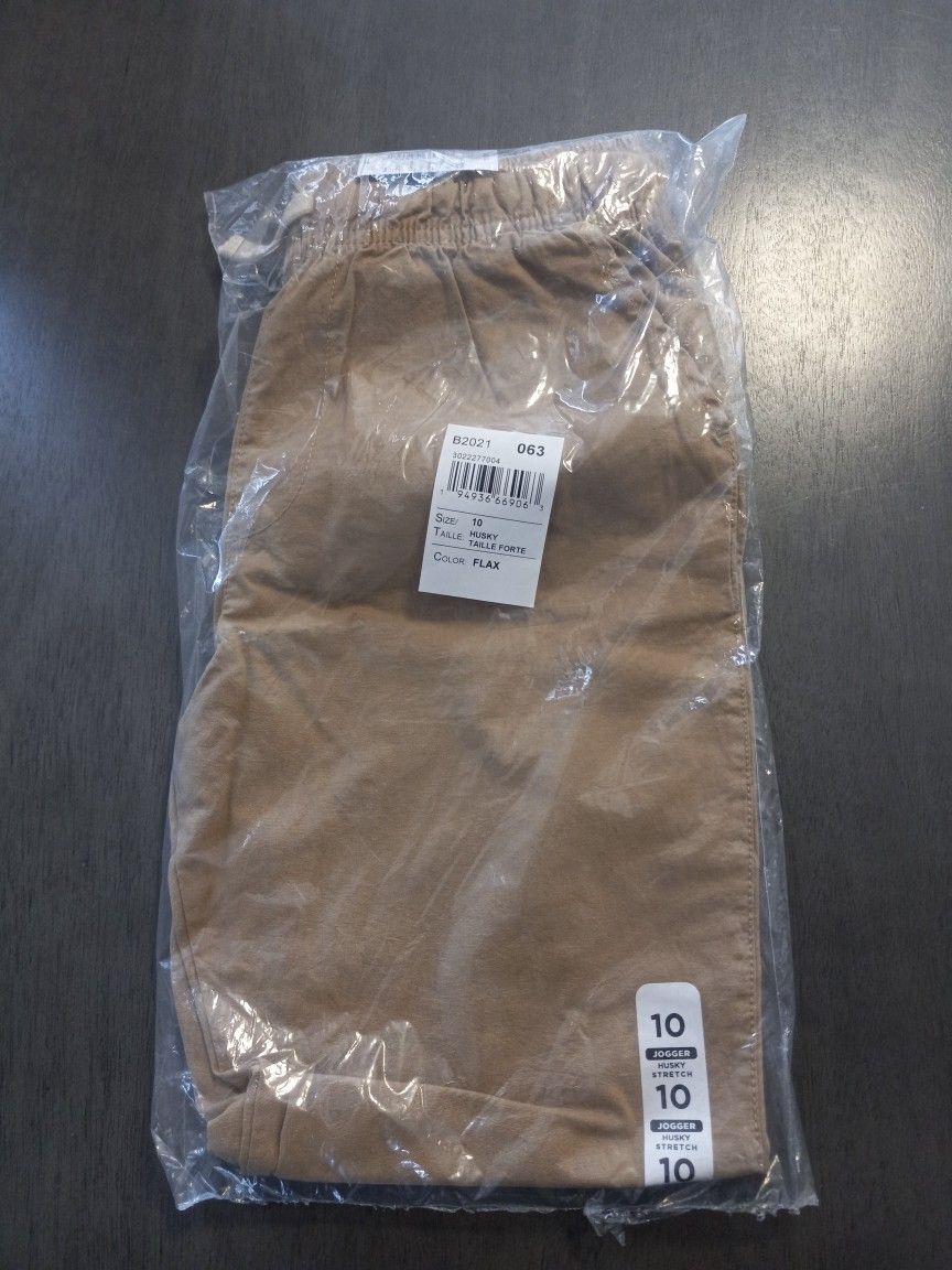Youth Tan Jogger Husky Stretch Pants Size 10 Nwt. Brandnew. In factory package. School Uniform or casual wear. Husky stretch Jogger pants. Can be worn by girls or boys. Drawstring closure. Will come as pictured. (Please see pictures for an idea of condition). Please ask any and all questions you might have.